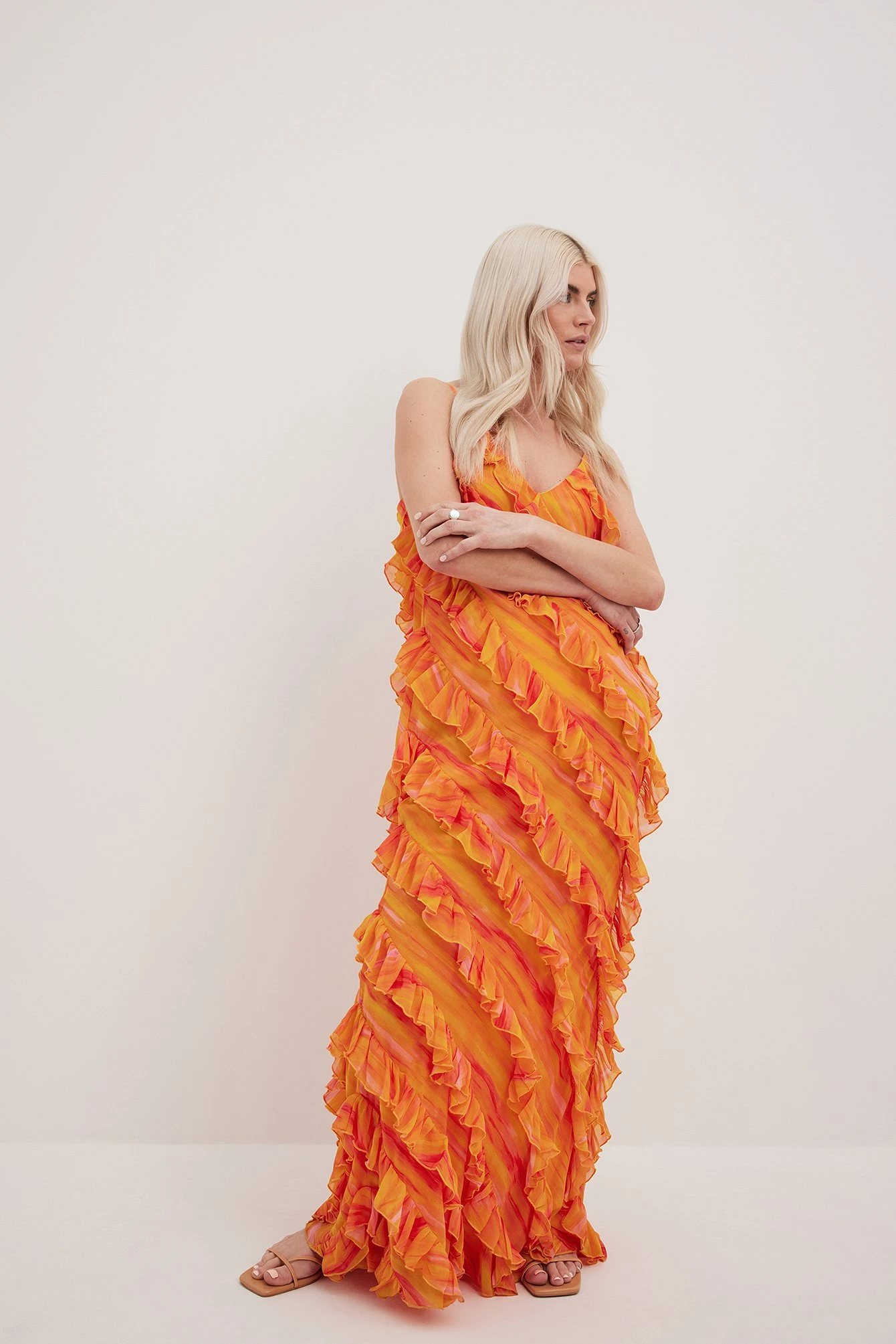 Cette robe longue est Ă volants et a des bretelles fines et rĂ©glables. Elle a un col en V et une doublure Ă l’intĂ©rieur.
