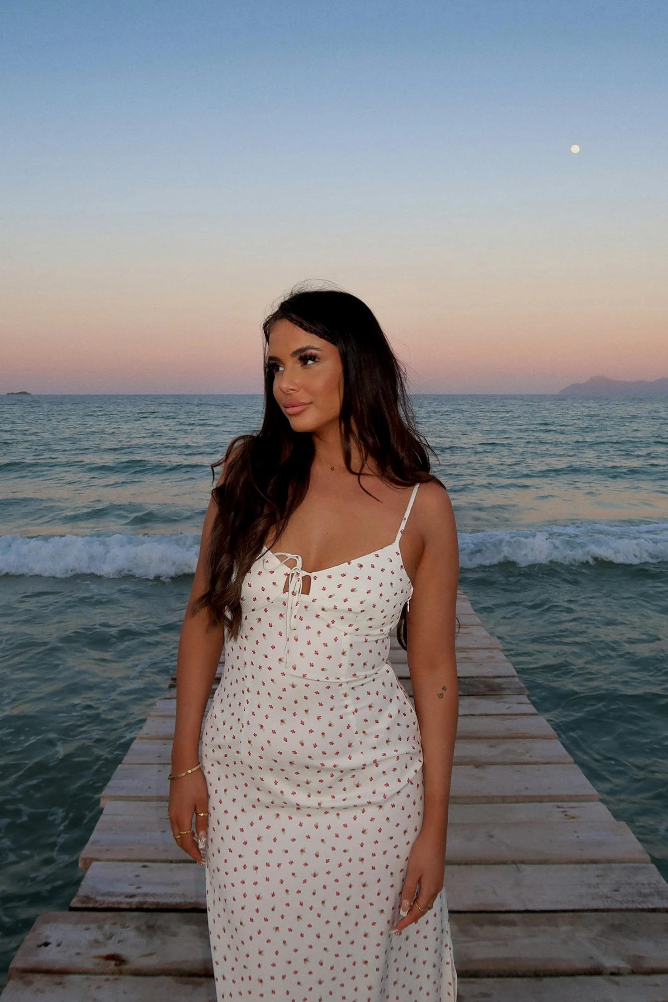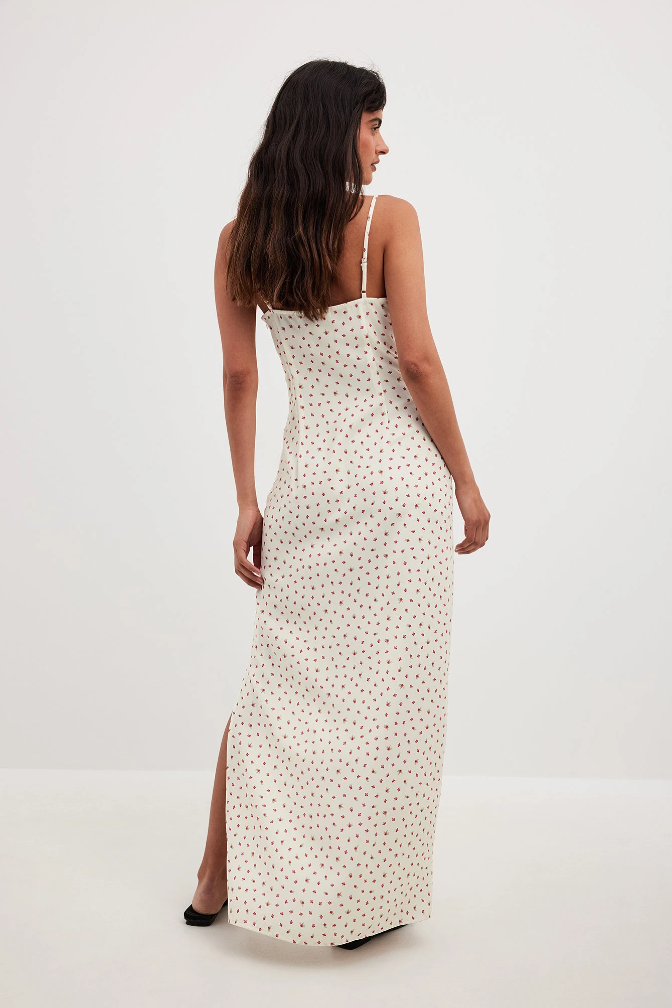 Cette robe a une taille longue. Elle a une coupe fluide et un noeud à nouer sur la poitrine. Cette robe a des bretelles fines et réglables, une fermeture éclair latérale cachée et un détail fendu sur le côté.
