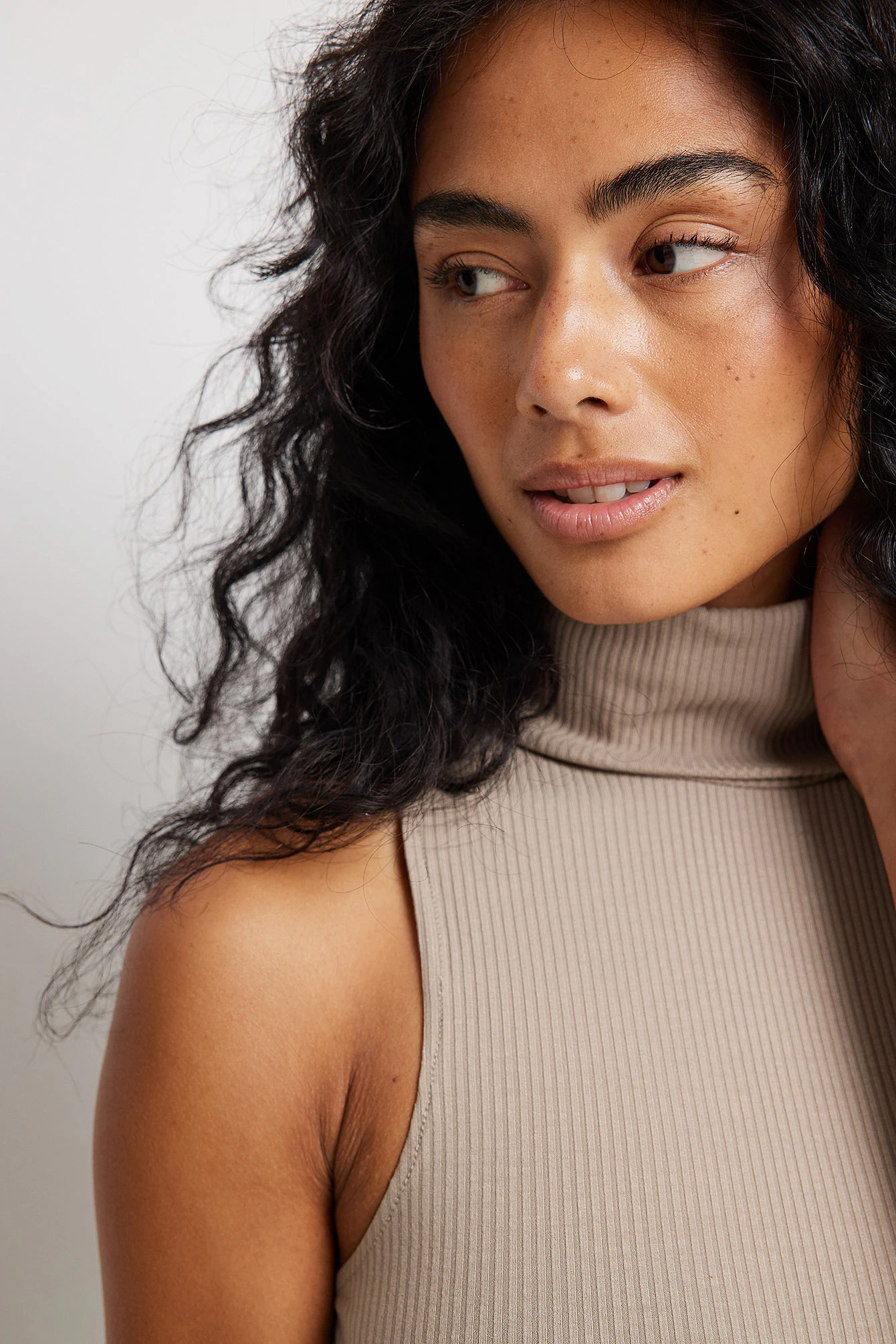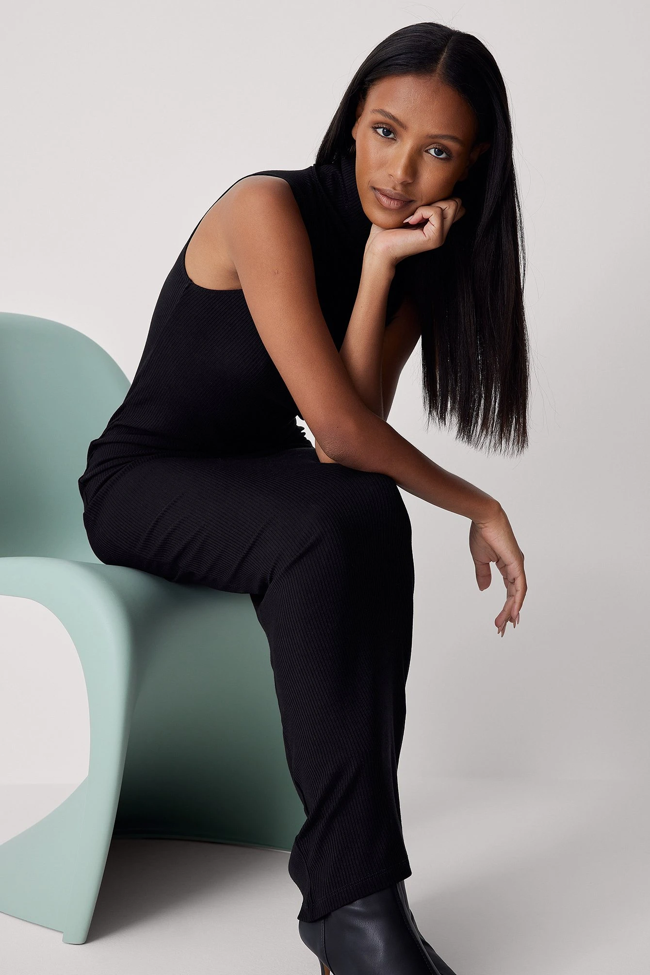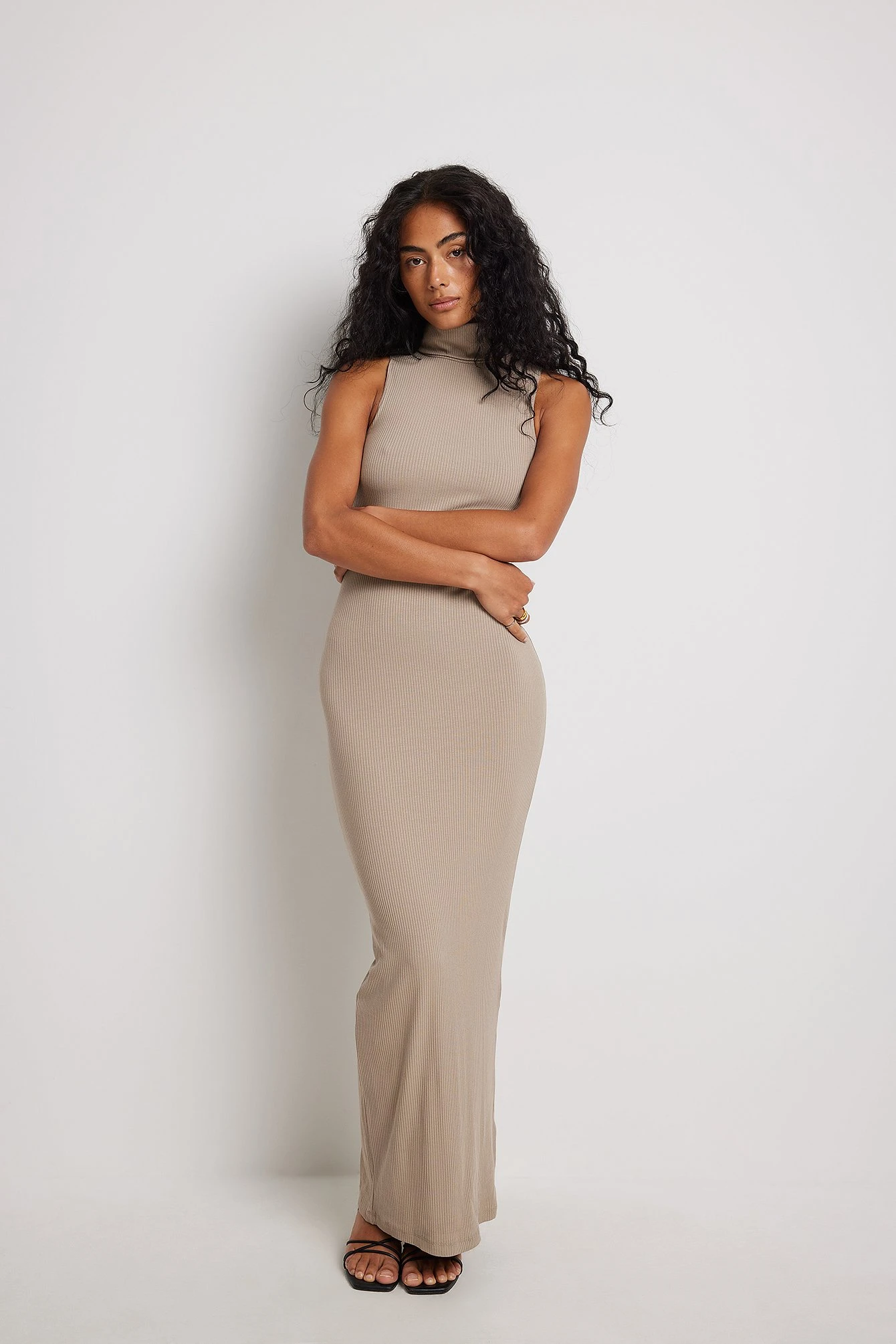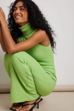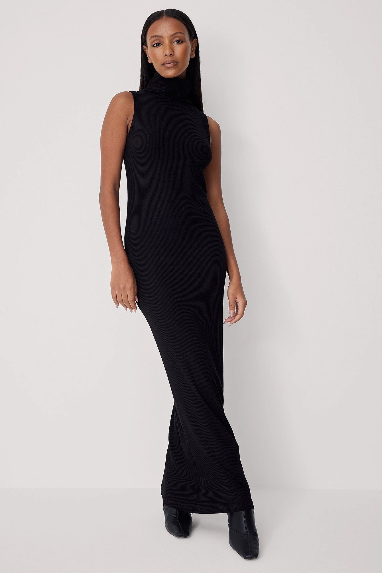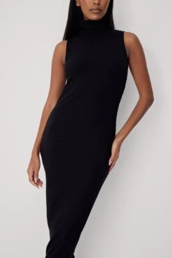 Cette robe longue est sans manches et a un col roulé, une coupe moulante et une matière élastique à nervures.