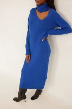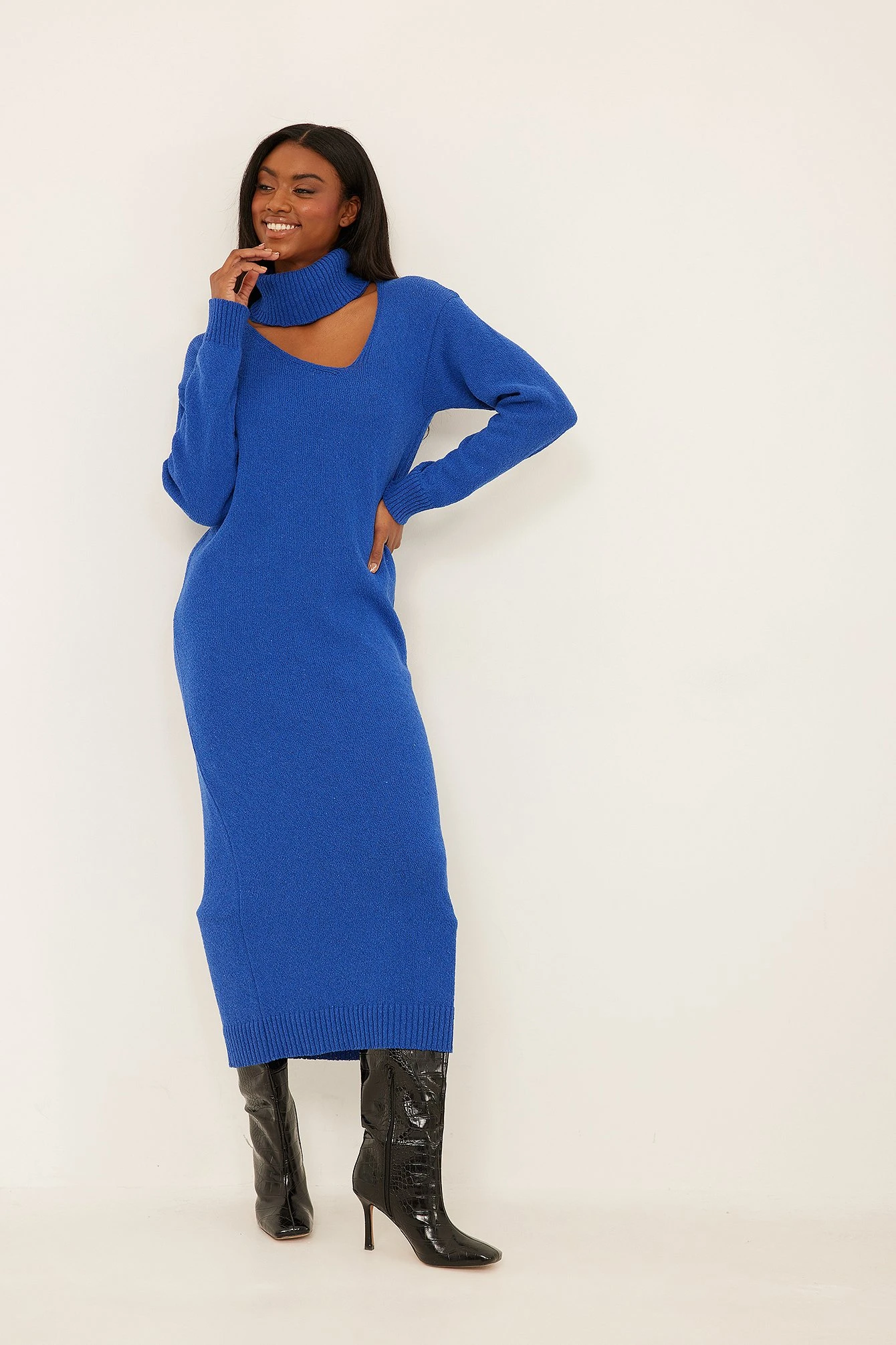 Cette robe longue a un col haut avec détail découpé et des manches longues.
