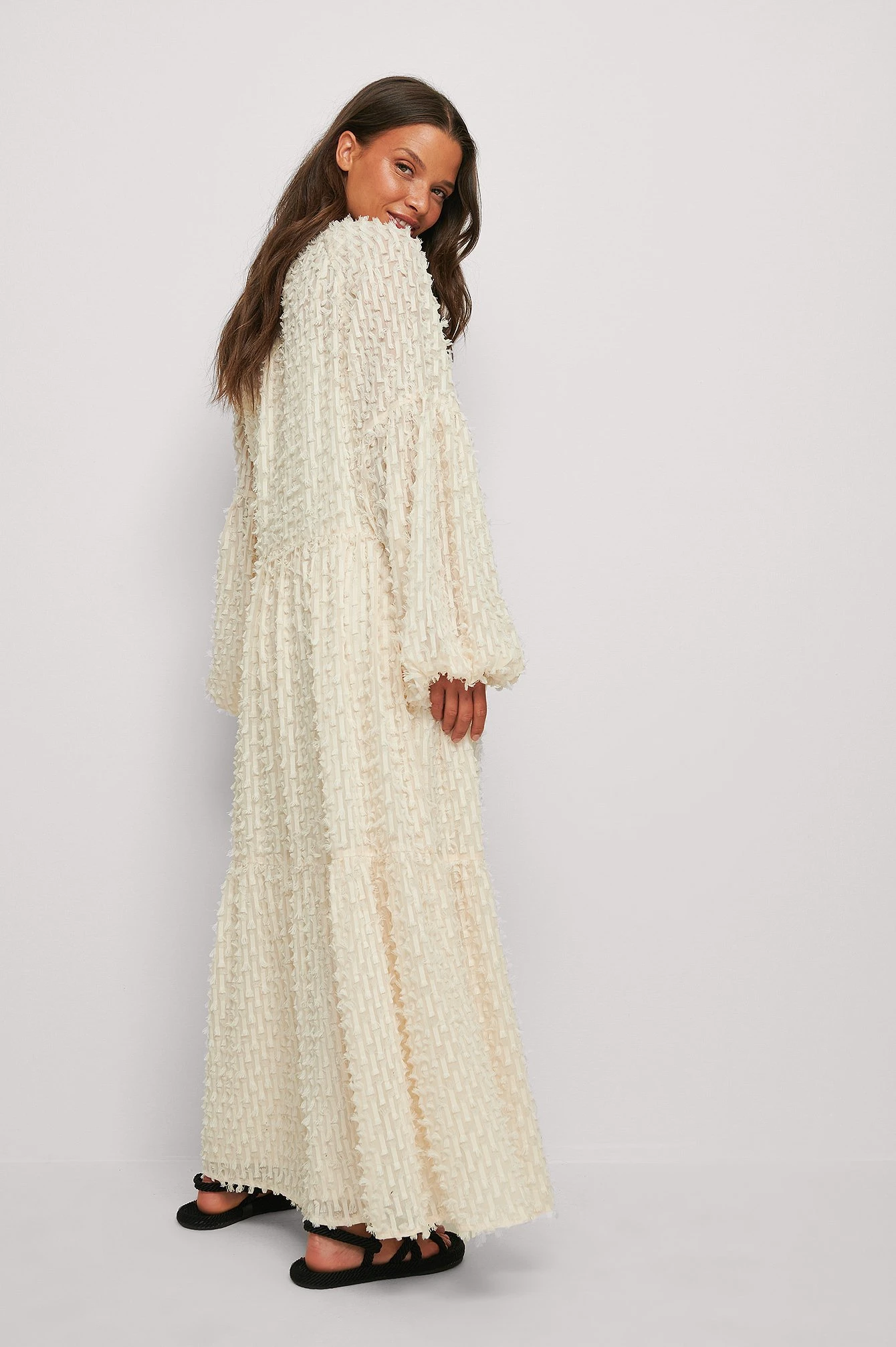 Cette robe longue a un col arrondi, un découpage avec détail auto-sérré, des manches ballon avec élastique à l’extrémité, une matière légèrement transparente, un effet peluche, une coupe fluide et un sous-vêtement avec col en V, bretelles fines réglables, taille midi et fente latérale.