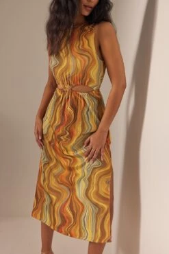 Cette robe a un col arrondi, des dĂ©tails dĂ©coupĂ©s Ă l’avant avec cordon Ă la taille, un dos ouvert avec bouton de fermeture au cou, une fente latĂ©rale et une taille midi.