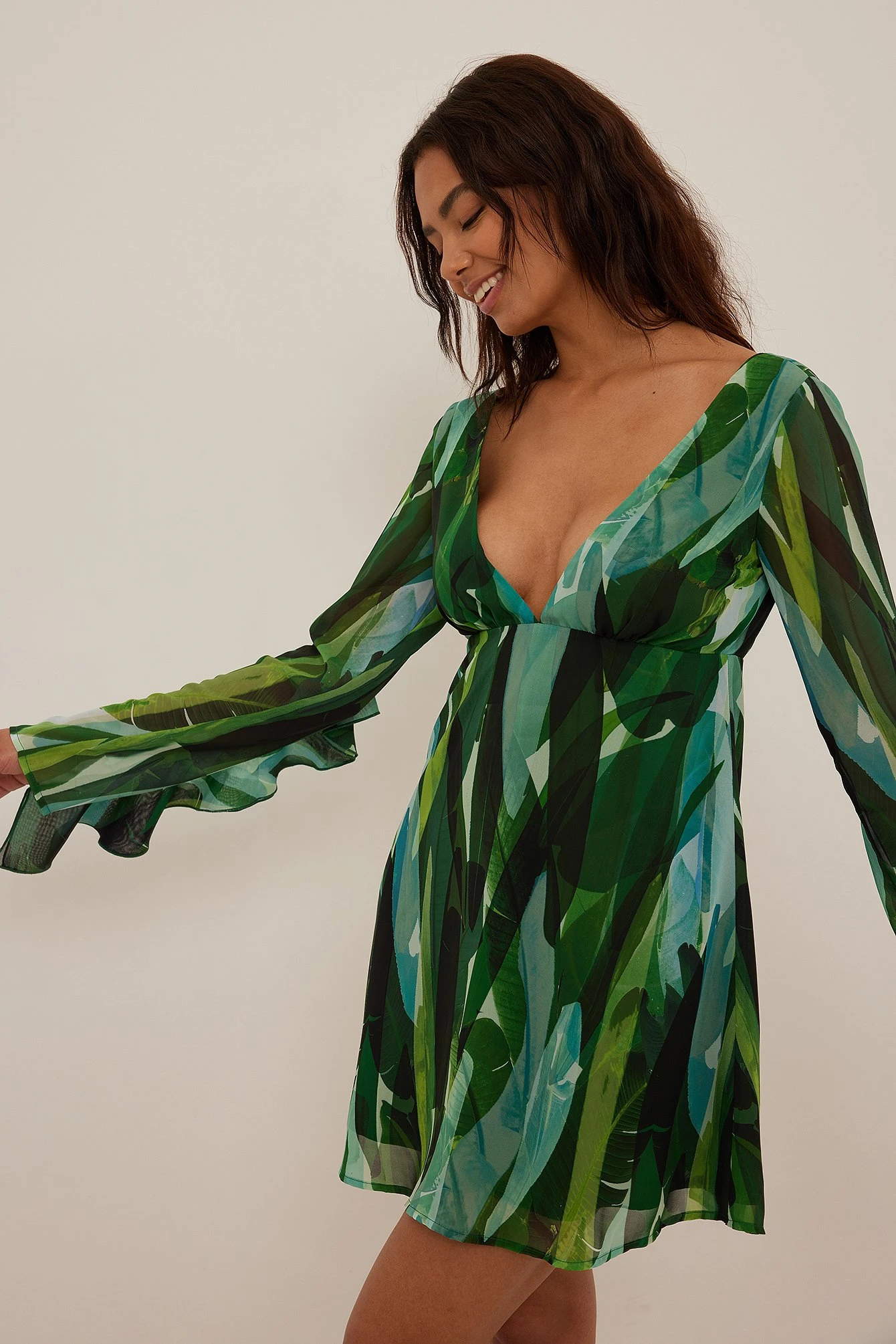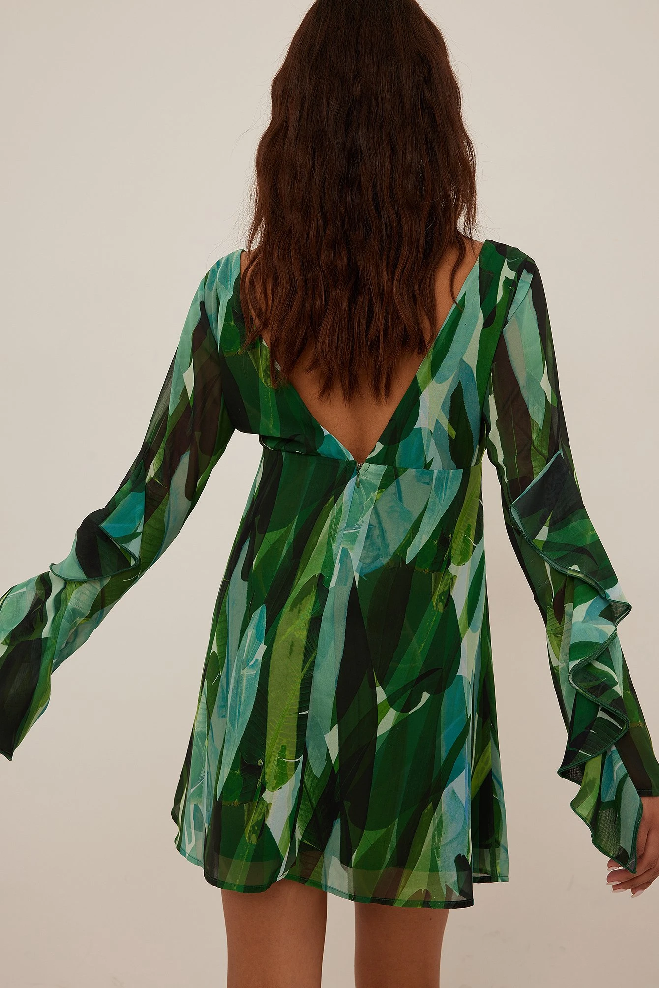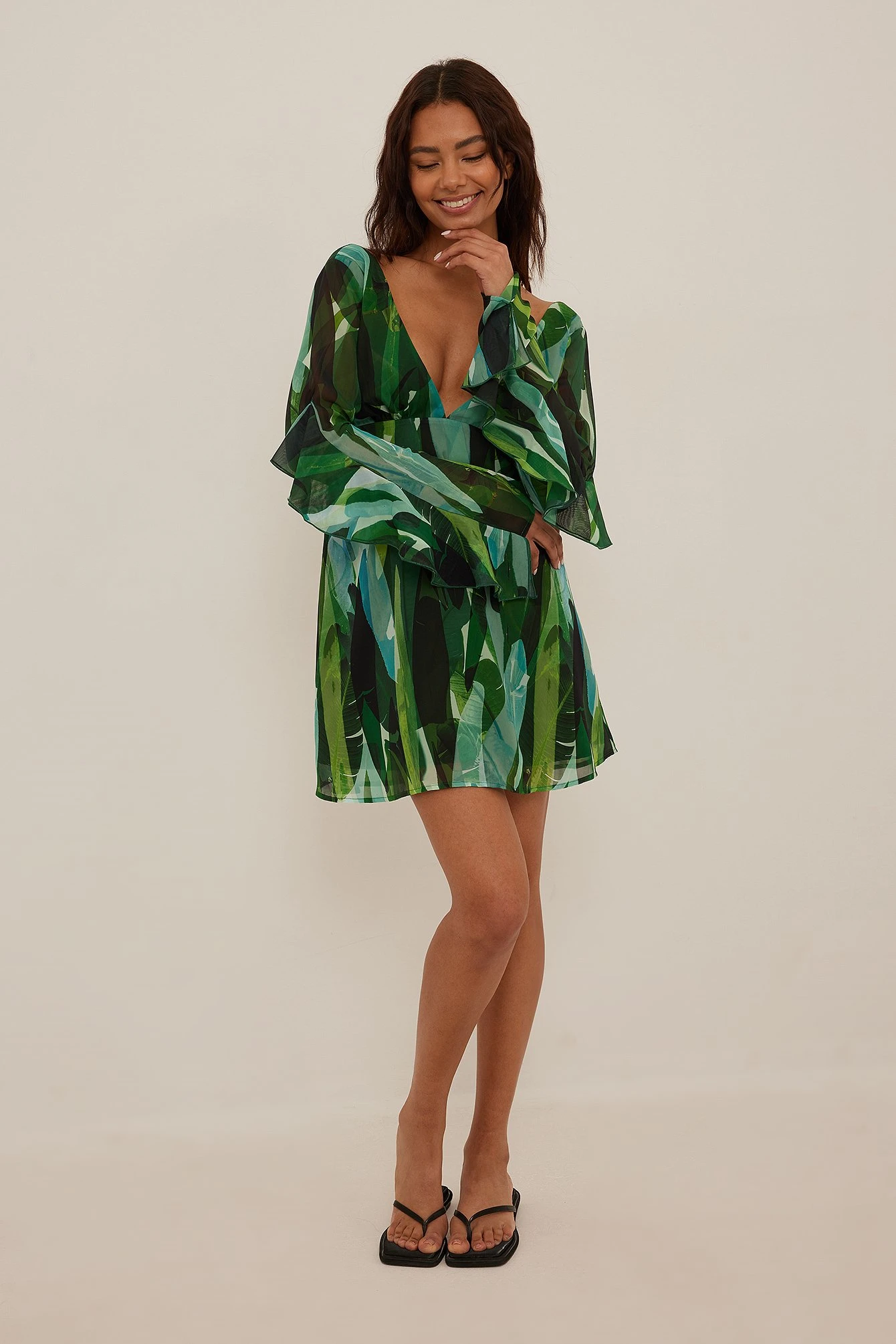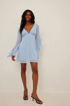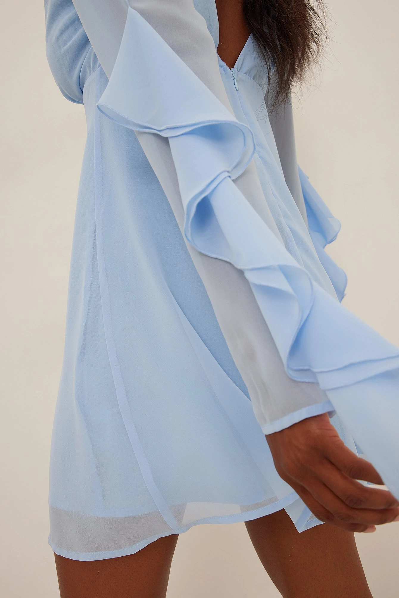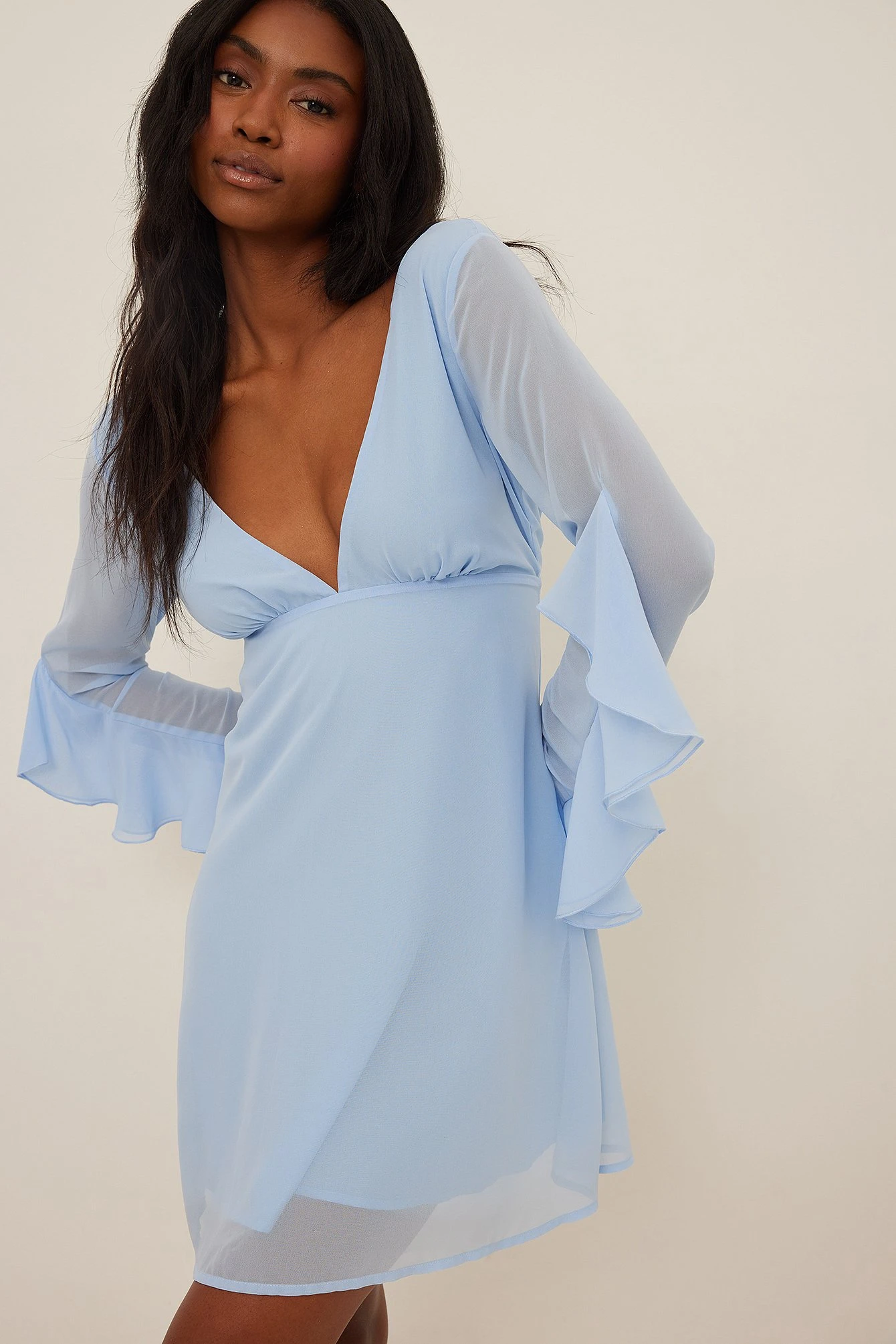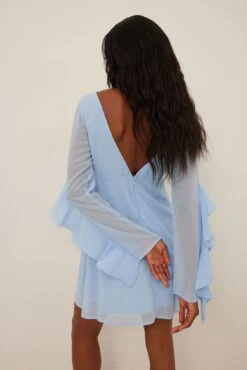 Cette robe courte a un col en V profond, un décolleté dos, des manches longues avec détails à volants et une fermeture éclair à l’arrière.