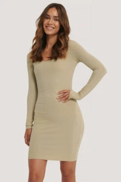 Cette robe a une encolure carrée, des manches longues, un design à côtes, une coupe slim et une taille courte.
