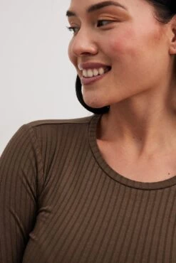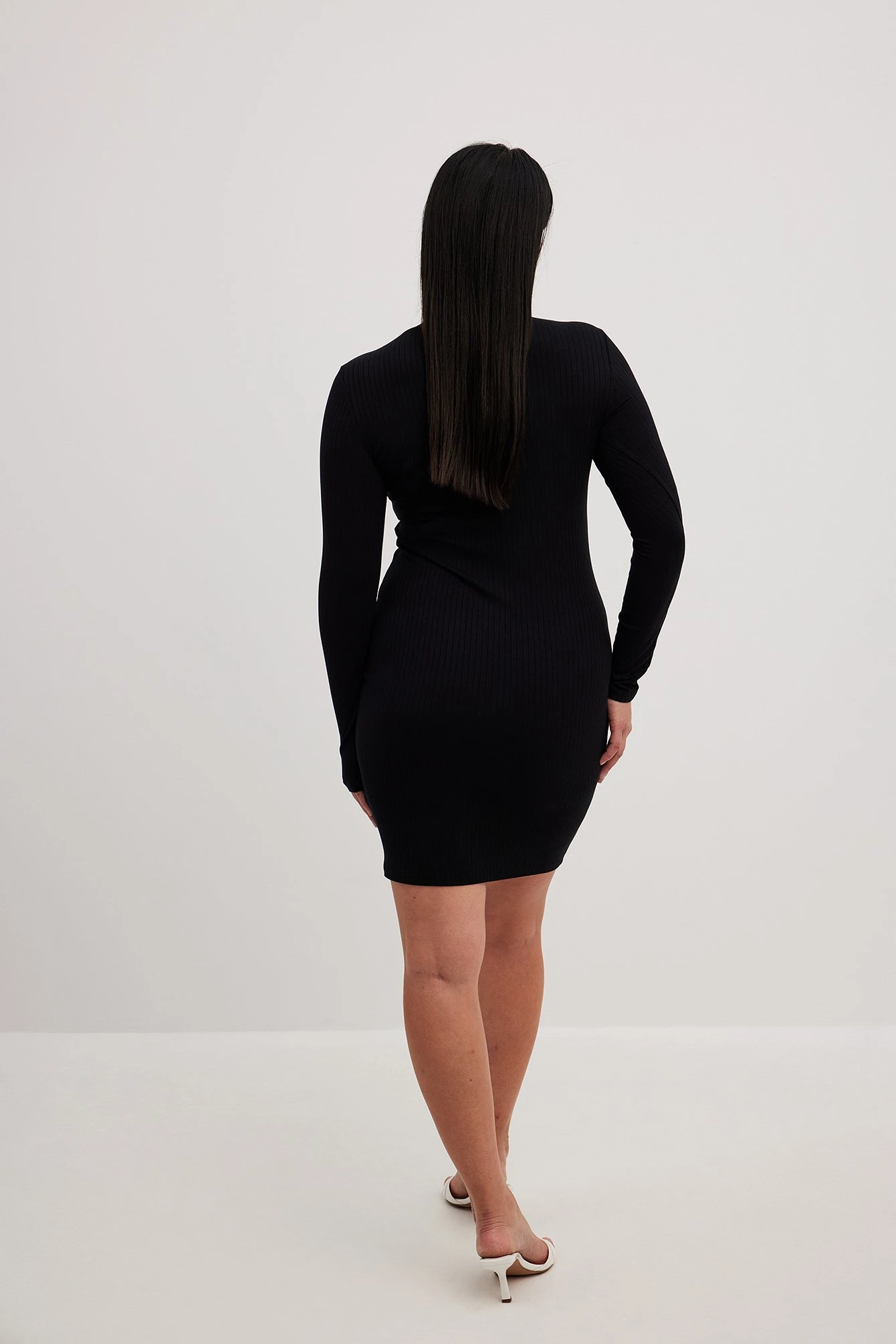 Cette robe courte a un col arrondi, des manches longues et une matière élastique à nervures.
