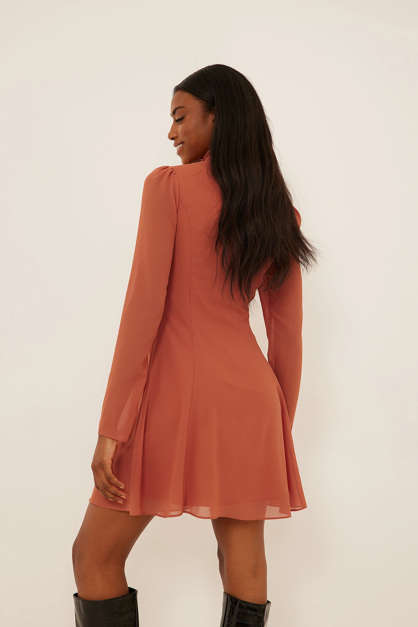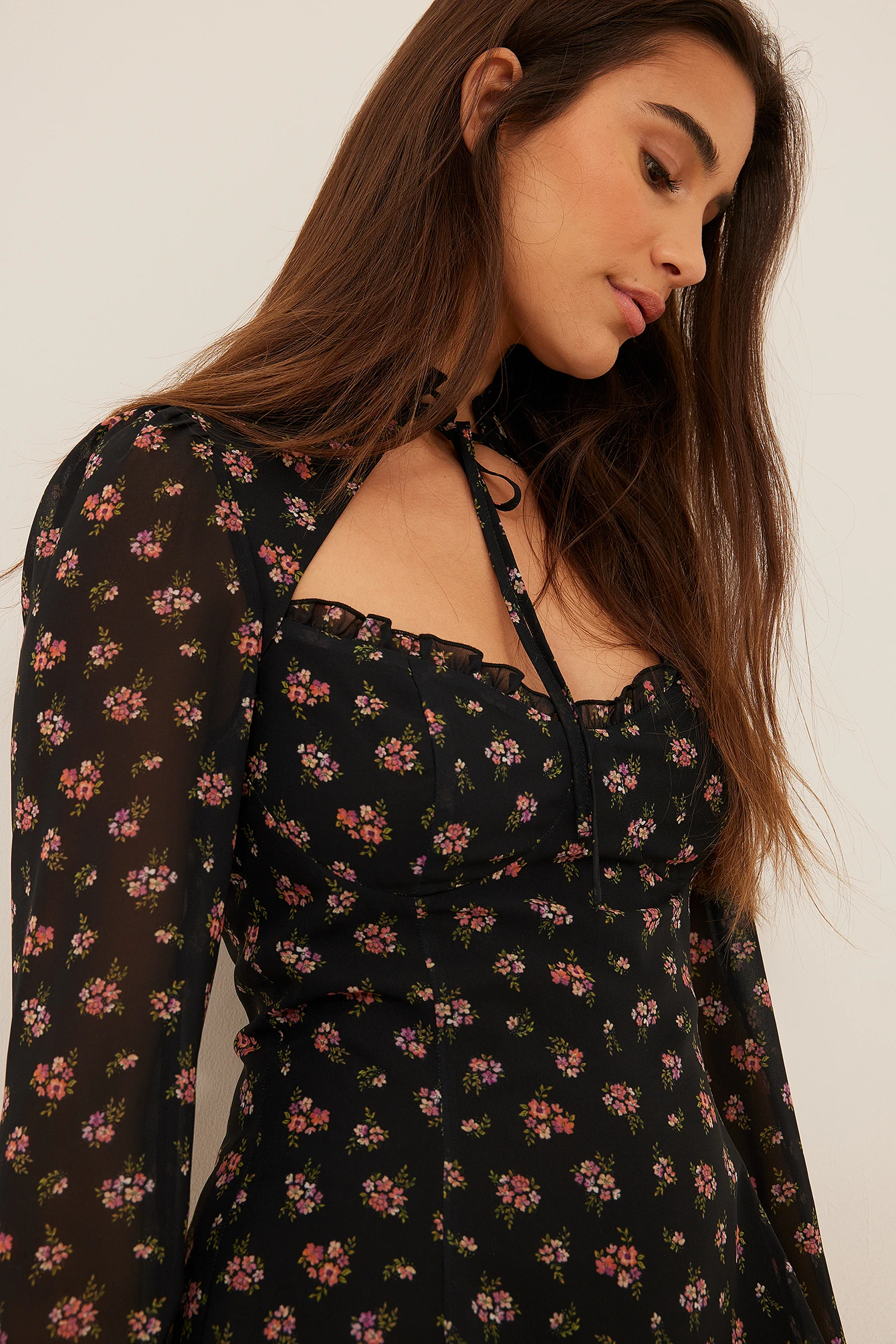 Cette robe courte a un col haut noué, un détail découpé et des manches longues transparentes.