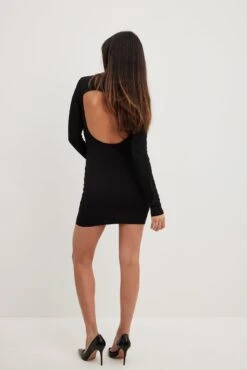 Cette robe courte a une coupe moulante. Elle a un design Ă dos ouvert et une encolure bateau. Cette robe courte a des manches longues.