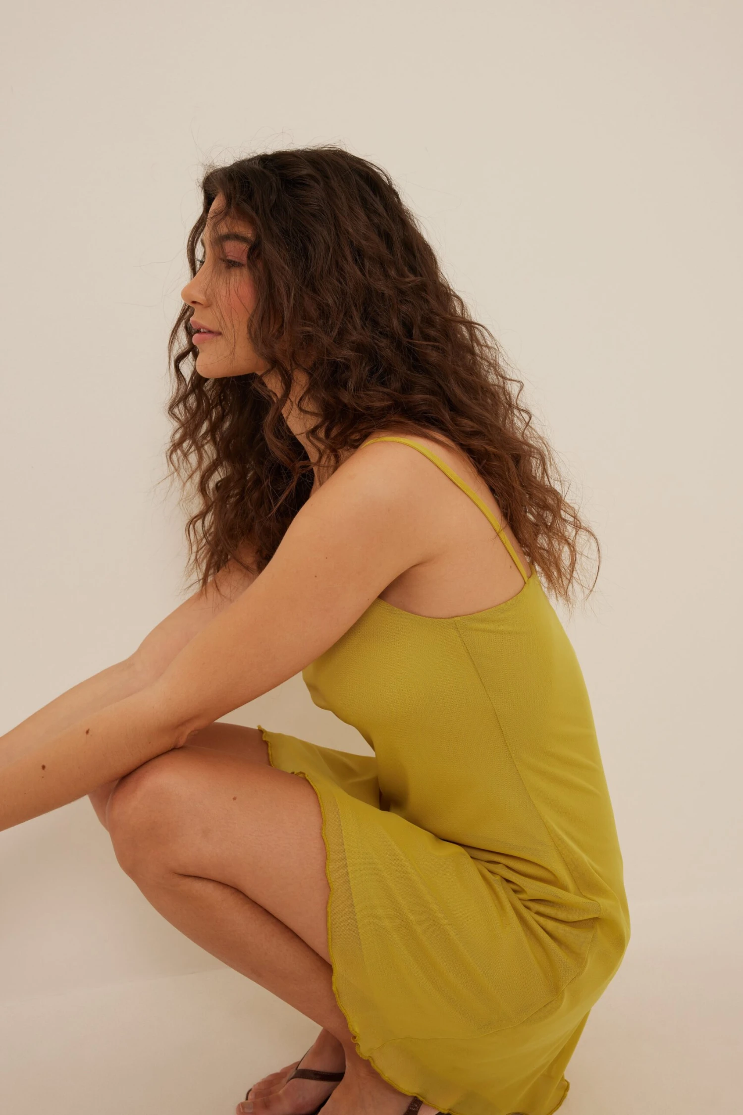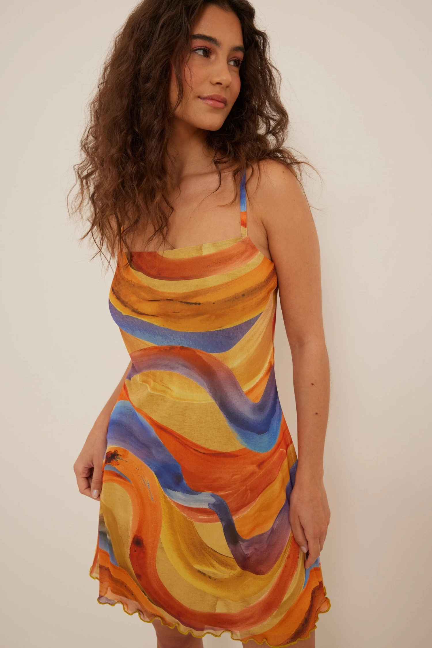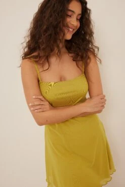Cette robe courte a des bretelles fines et une matière en maille transparente avec doublure.