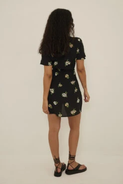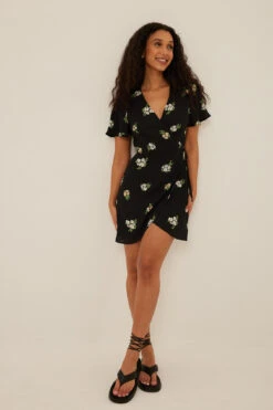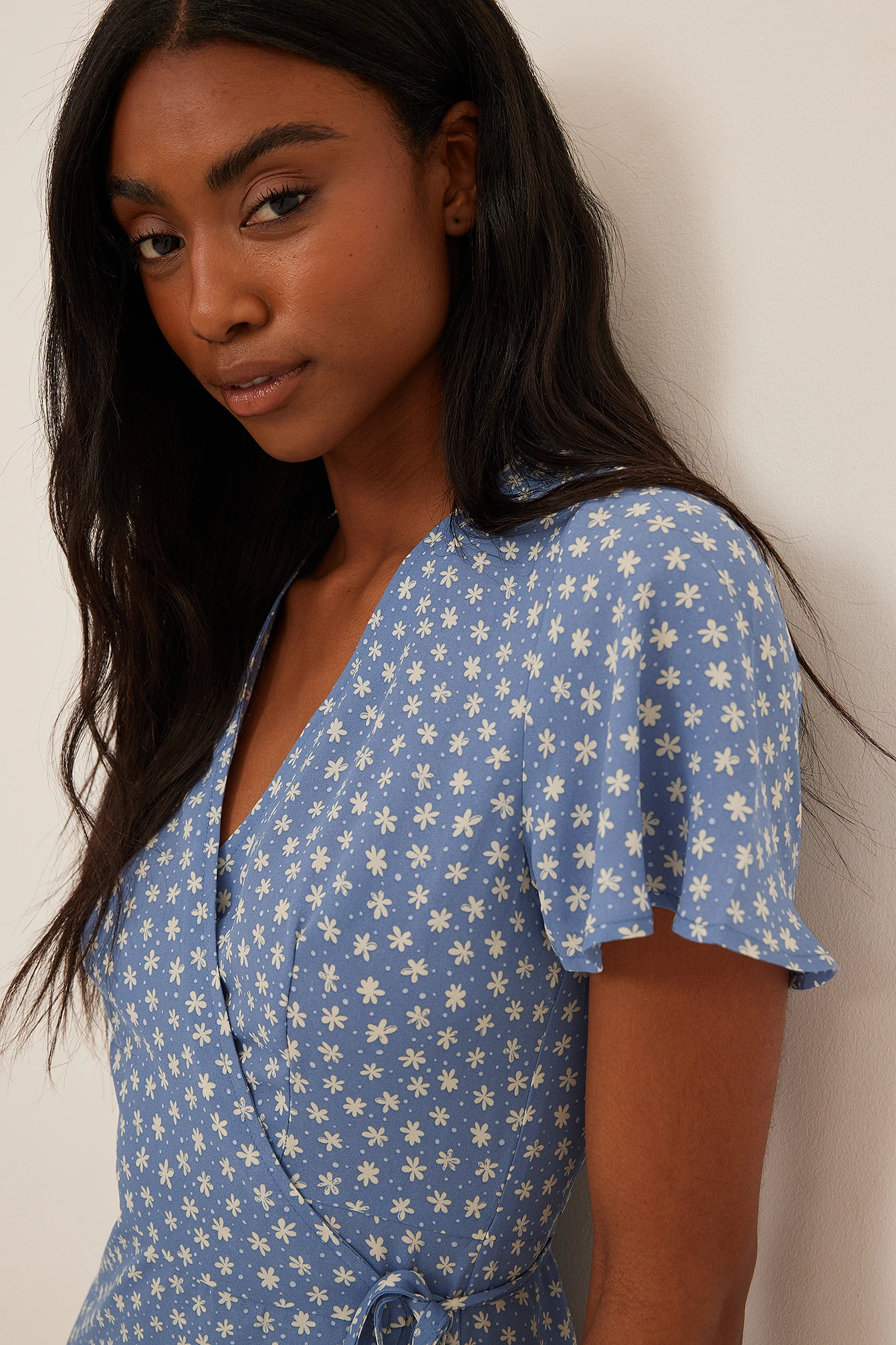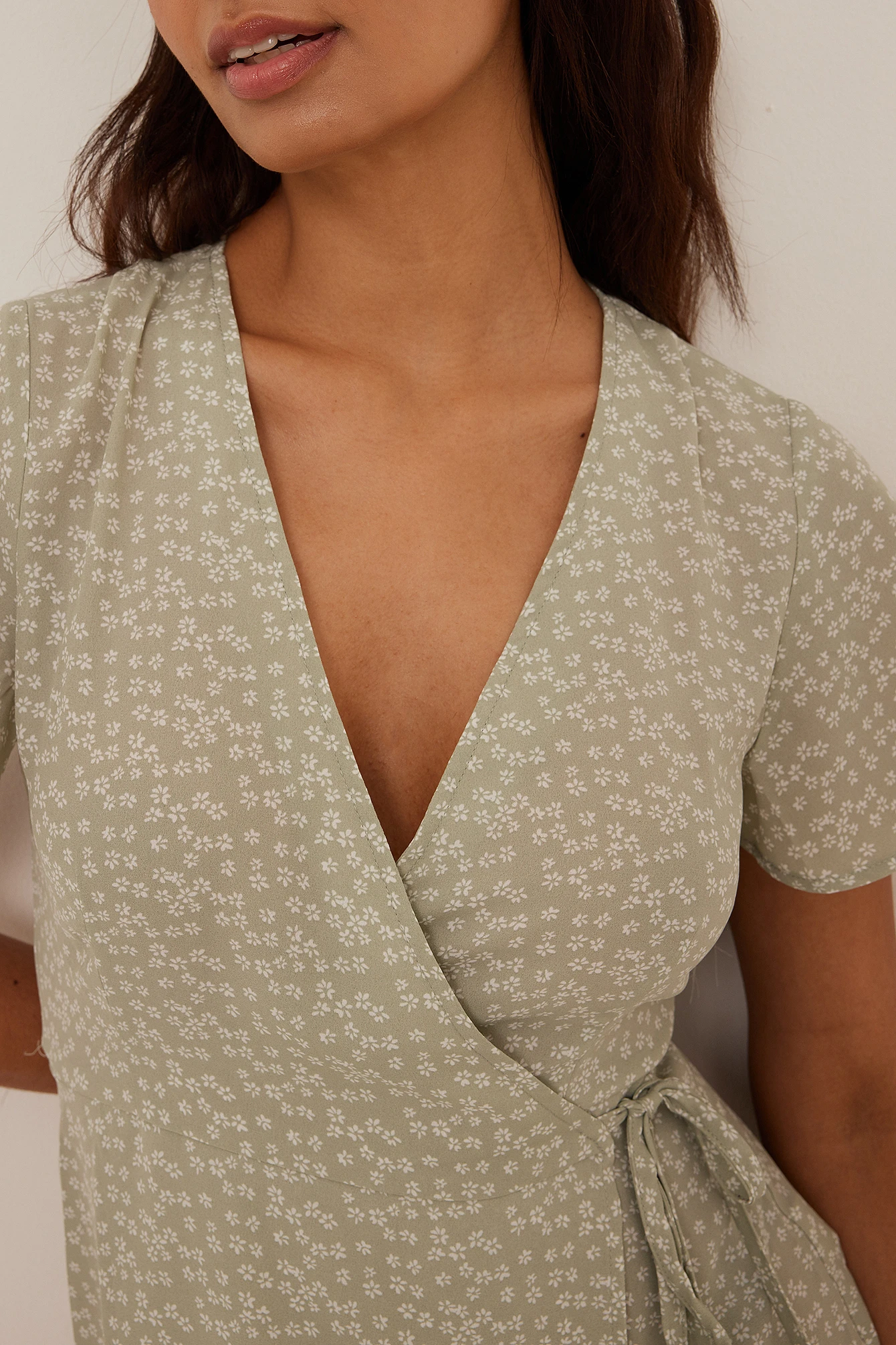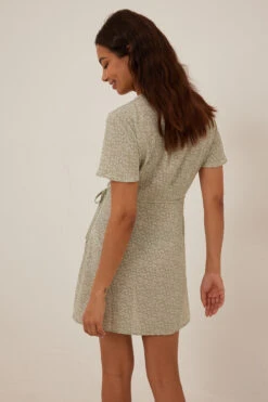 Cette robe courte a des manches courtes et un design enveloppant avec ajustable.