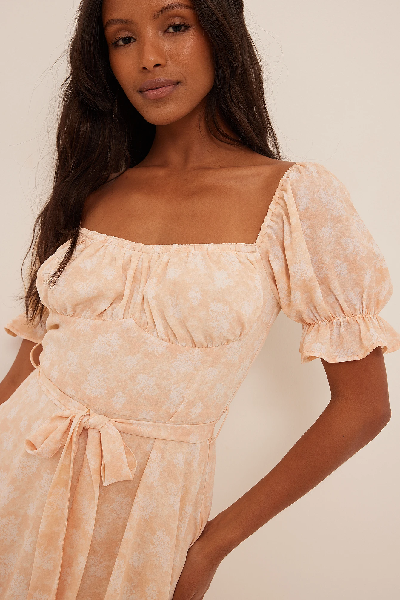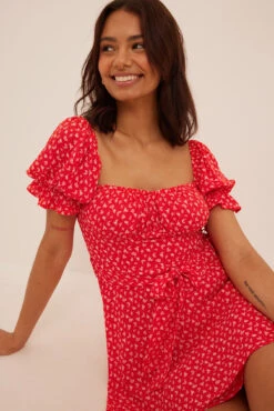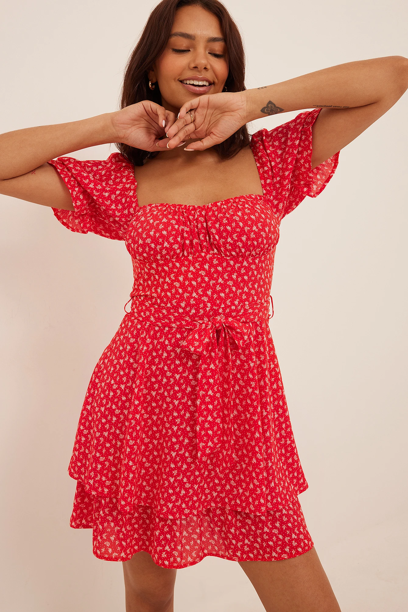 Cette robe courte a un décolleté en coeur, des manches courtes bouffantes avec petits détails à volants, une poitrine froncée, un détail noué autour de la taille, une fermeture éclair au bas du dos et des couches volantées au bas.