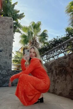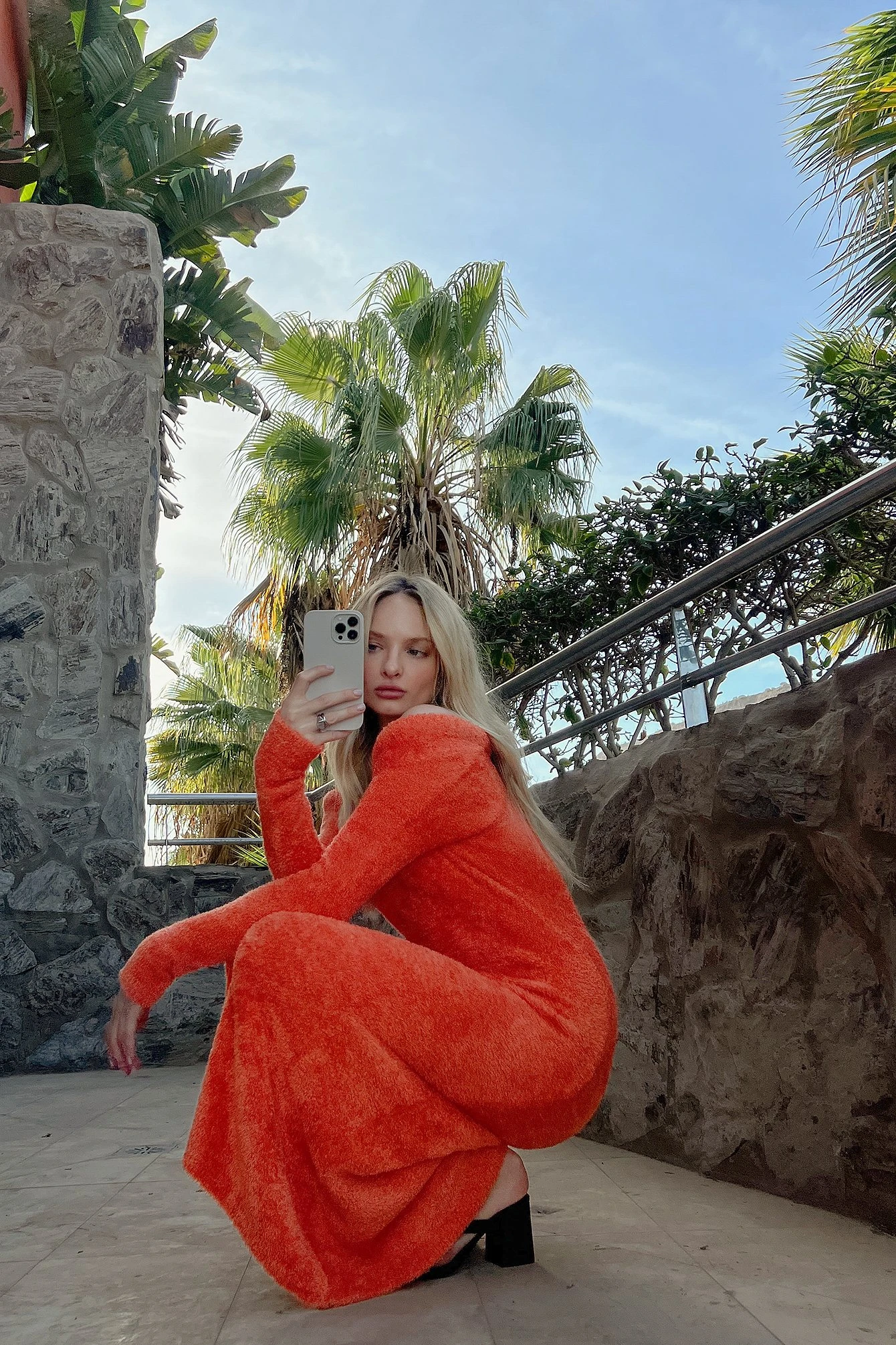 Cette robe longue est moelleuse et a des manches longues, une encolure dégagée et un toucher doux.