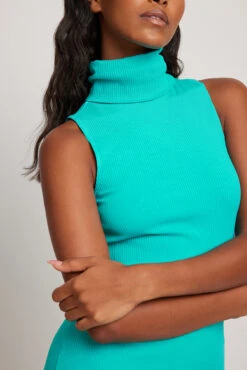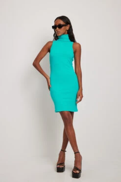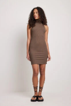 Cette robe courte a un col roulé, une coupe serrée et une matière élastique à nervures.
