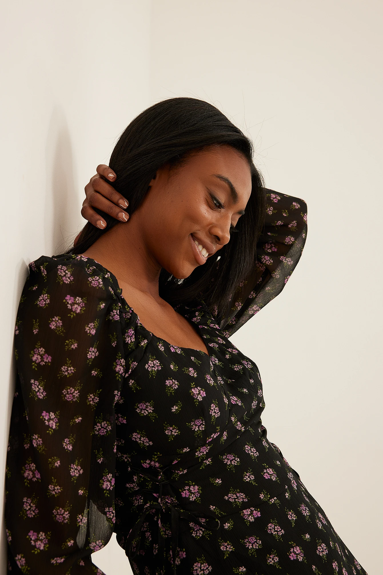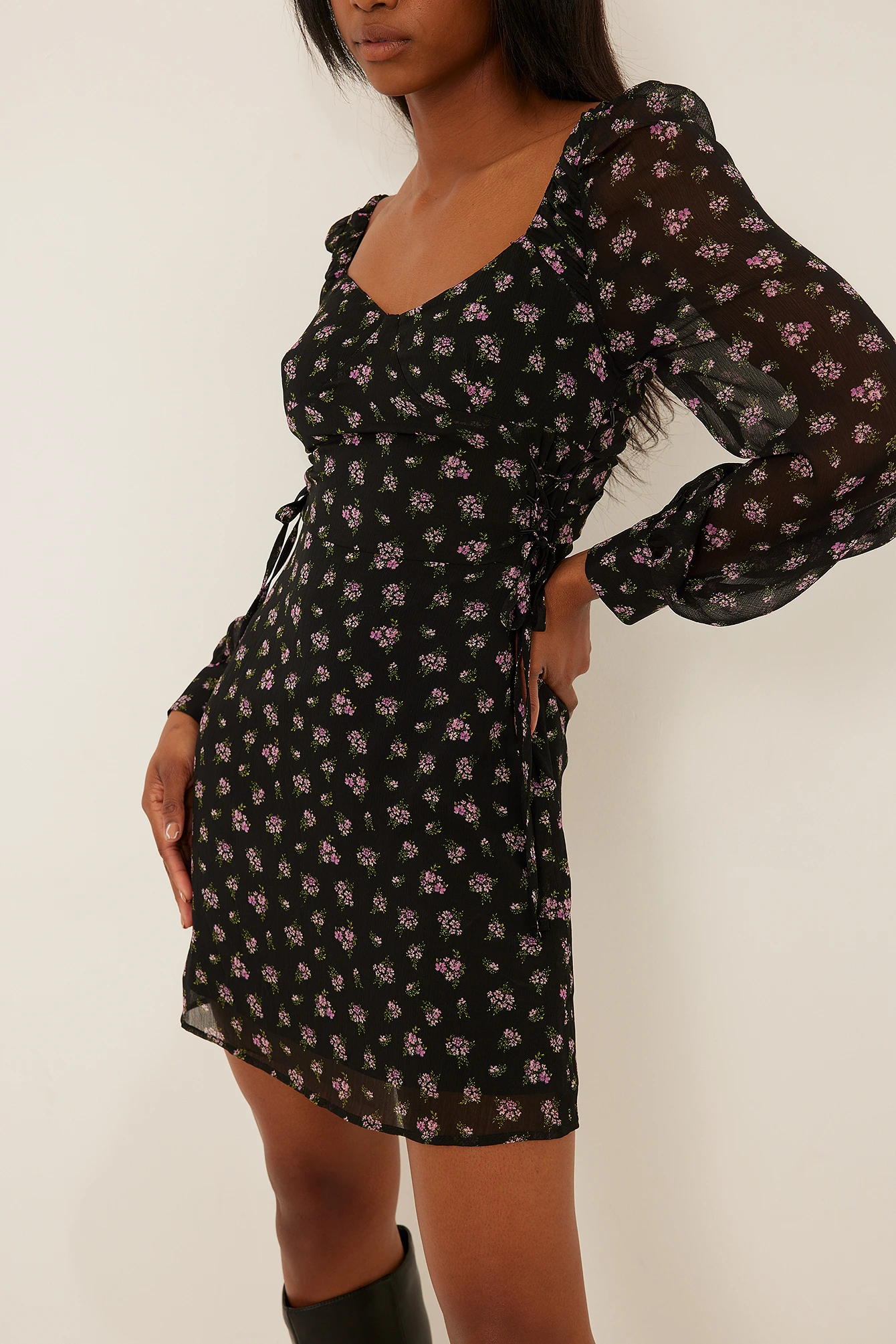 Cette robe courte a un dĂ©colletĂ© en coeur avec dĂ©tails de couture sur la poitrine, de l’en mousseline de soie, des dĂ©tails froncĂ©s aux Ă©paules, des manches longues transparentes avec poignets Ă double boutonnage et un cordon sur les cĂ´tĂ©s.