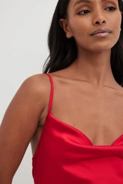 Cette robe a du satin. Elle a un col bénitier et des bretelles fines réglables. Cette robe a une coupe fluide et une taille courte.