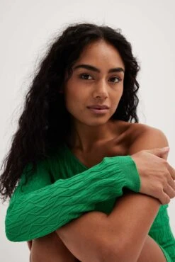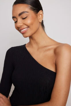 Cette robe courte a un design à une épaule avec manche longue, des ourlets à nervures et une matière élastique, tricotée et imprimée.