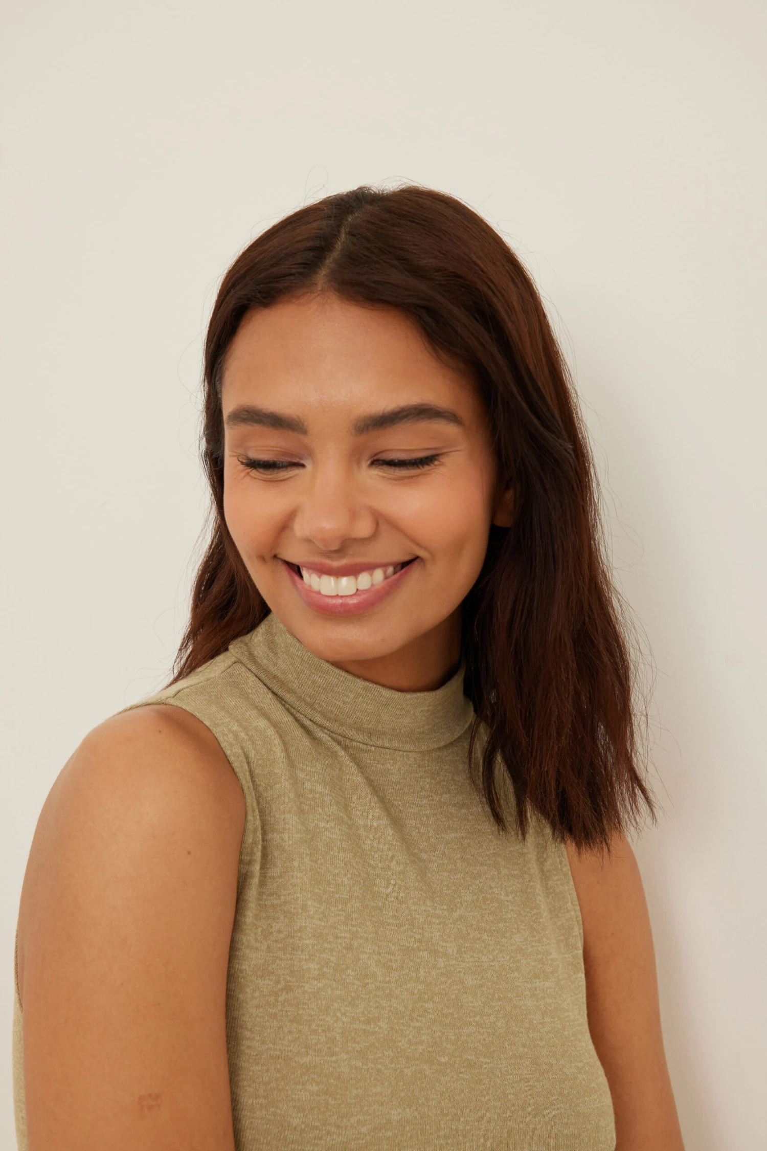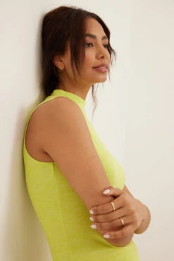 Cette robe midi a un col haut à l’arrière avec bouton de fermeture, un détail fendu sur le côté et une matière élastique.