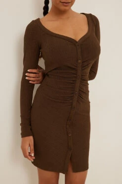 Cette robe a un col en V, des manches longues, un bouton de fermeture Ă l’avant, une taille courte et une matière Ă©lastique.