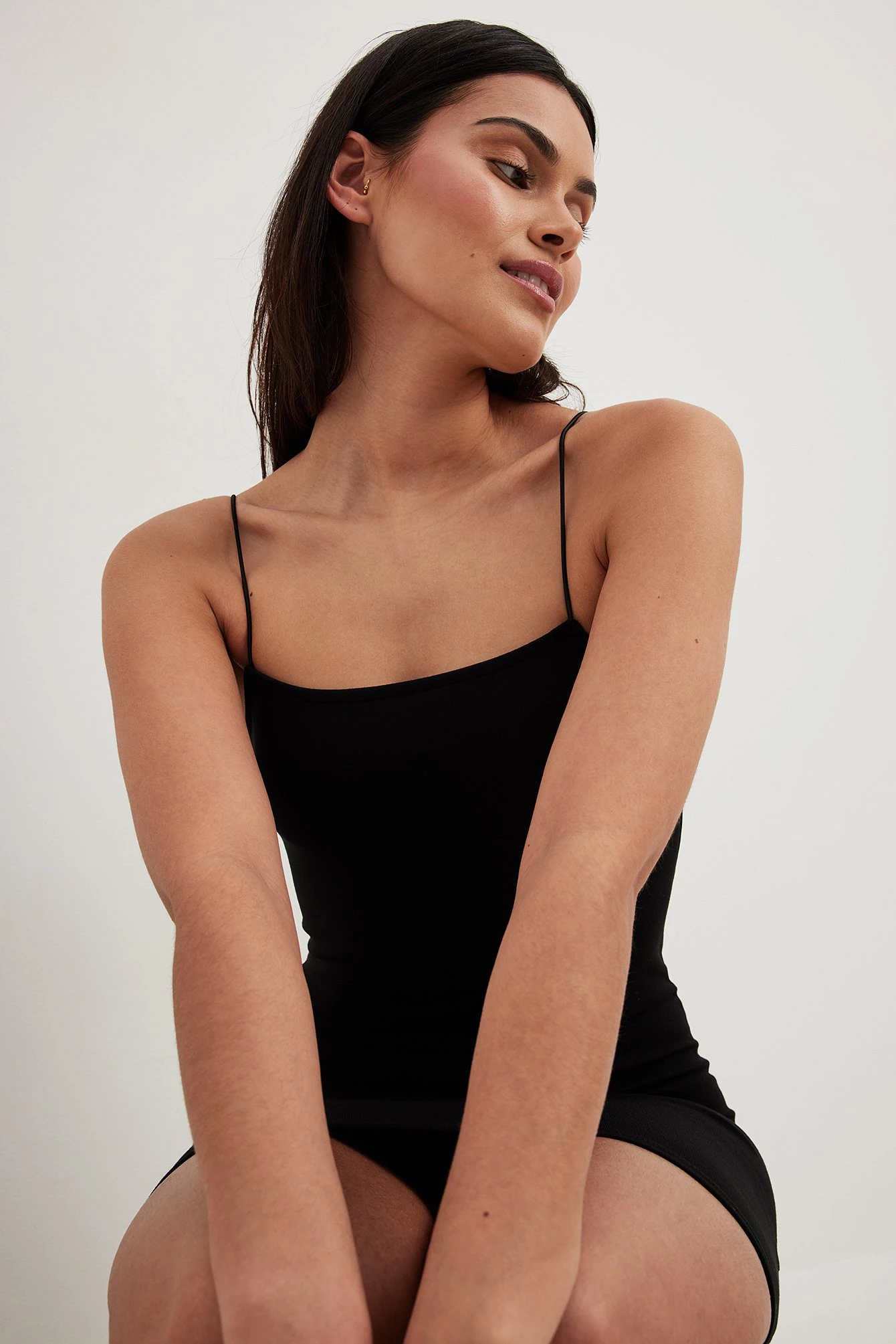 Cette robe a une coupe moulante et une matière élastique. Elle a un col carré, des bretelles fines et une taille courte.