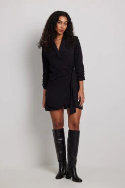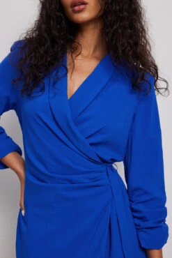 Cette robe a un col en V. Elle a des épaules rembourrées et une manche trois quarts avec froncements. Cette robe a un design chevauchant avec noeud de bretelles réglable et une doublure.