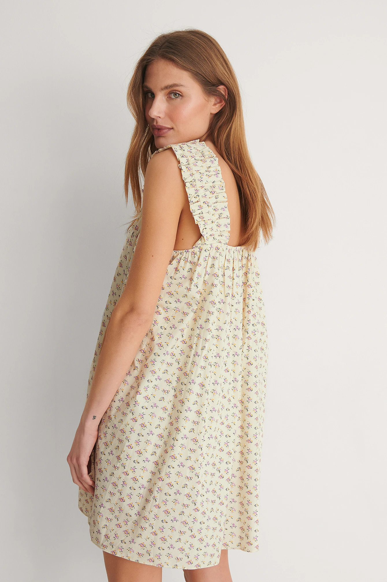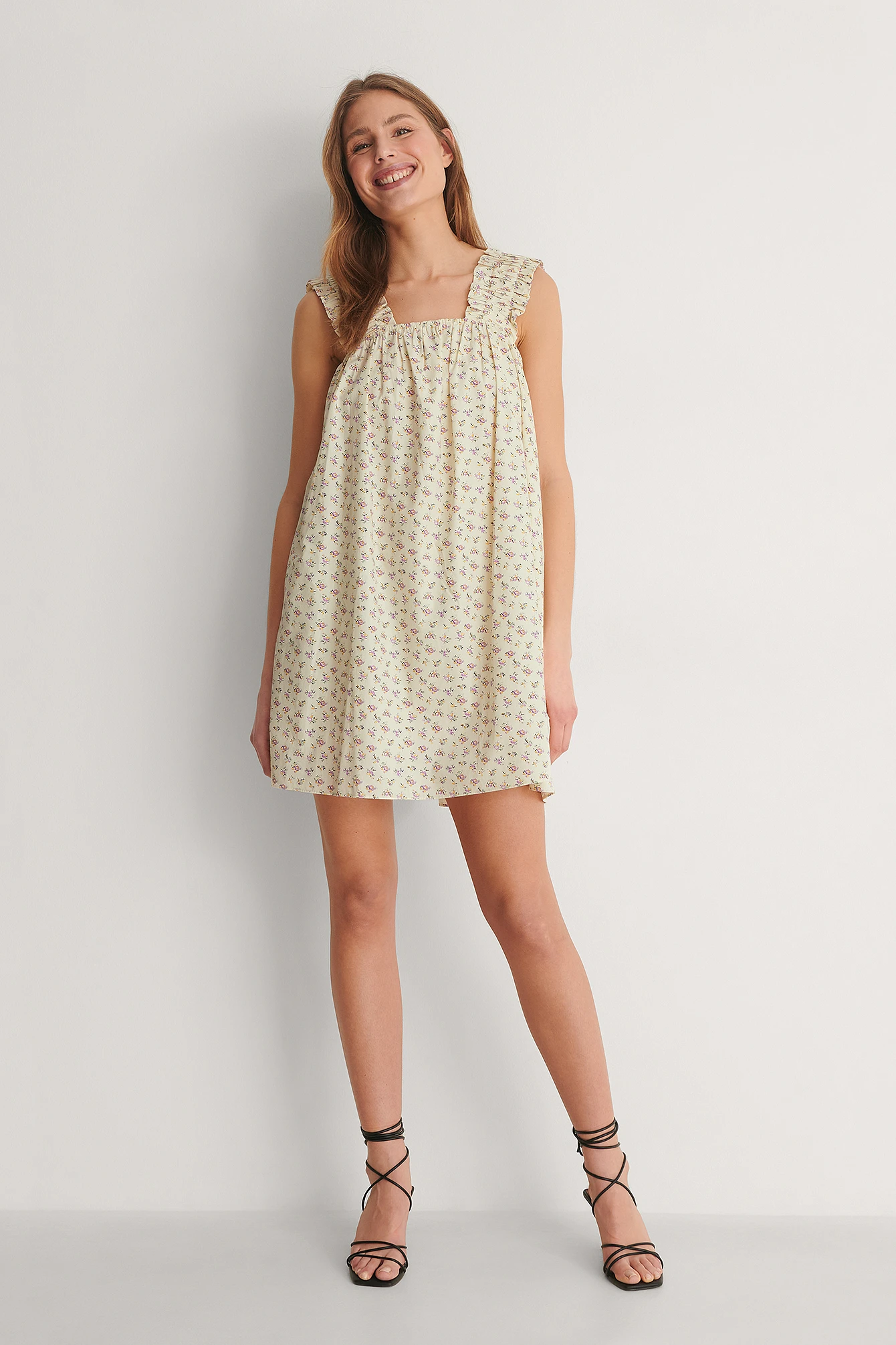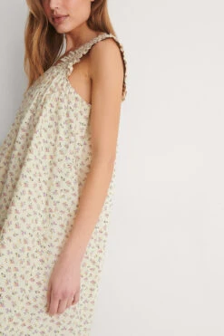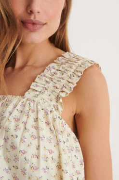 Cette robe a des bretelles larges et froncées, un cou carré, un design sans manches et une taille courte.