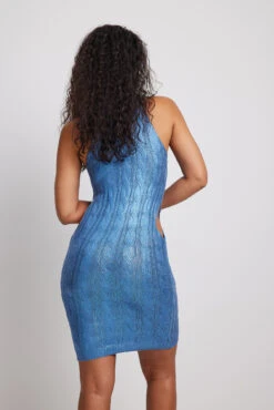Cette robe courte est tricotée et a une bretelle tour du cou, un détail découpé sur les côtés et une maille torsadée le long du vêtement.