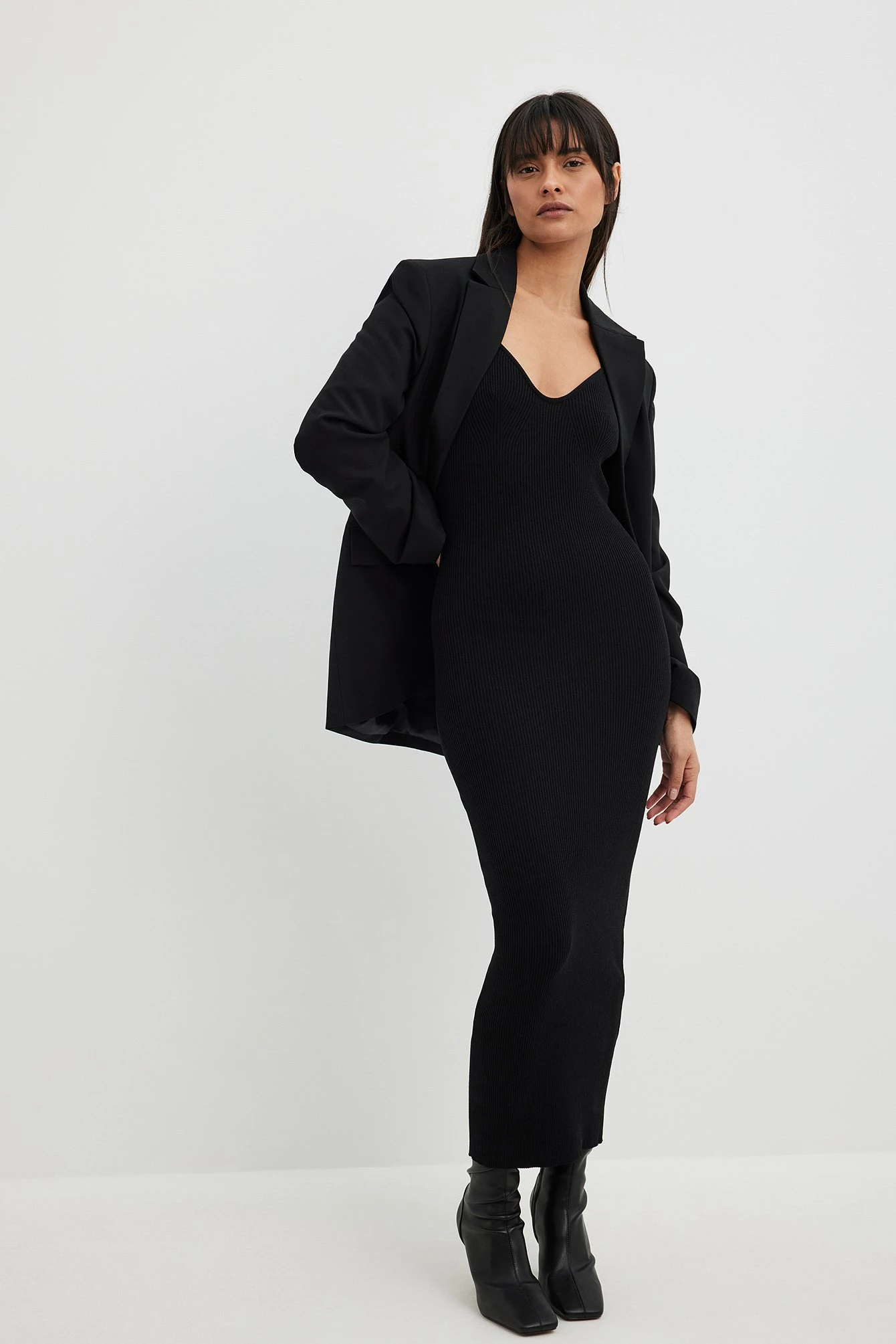 Cette robe midi est tricotée et à nervures et a un col en forme de coeur. Elle est élastique et a une bretelle tour de cou avec lacet.