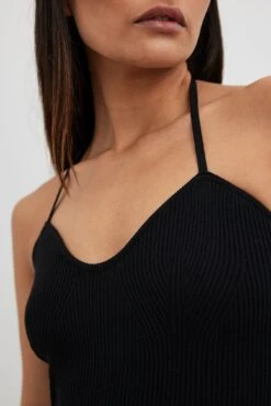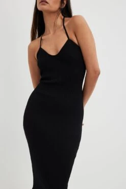 Cette robe midi est tricotée et à nervures et a un col en forme de coeur. Elle est élastique et a une bretelle tour de cou avec lacet.