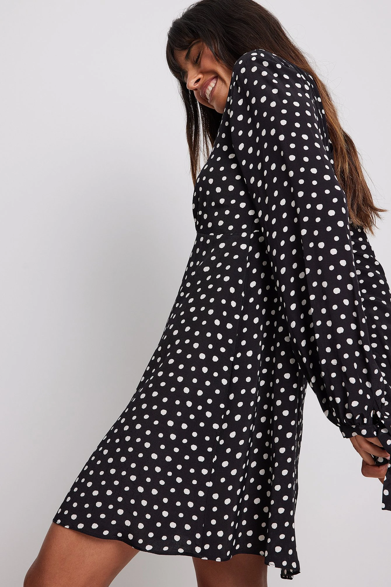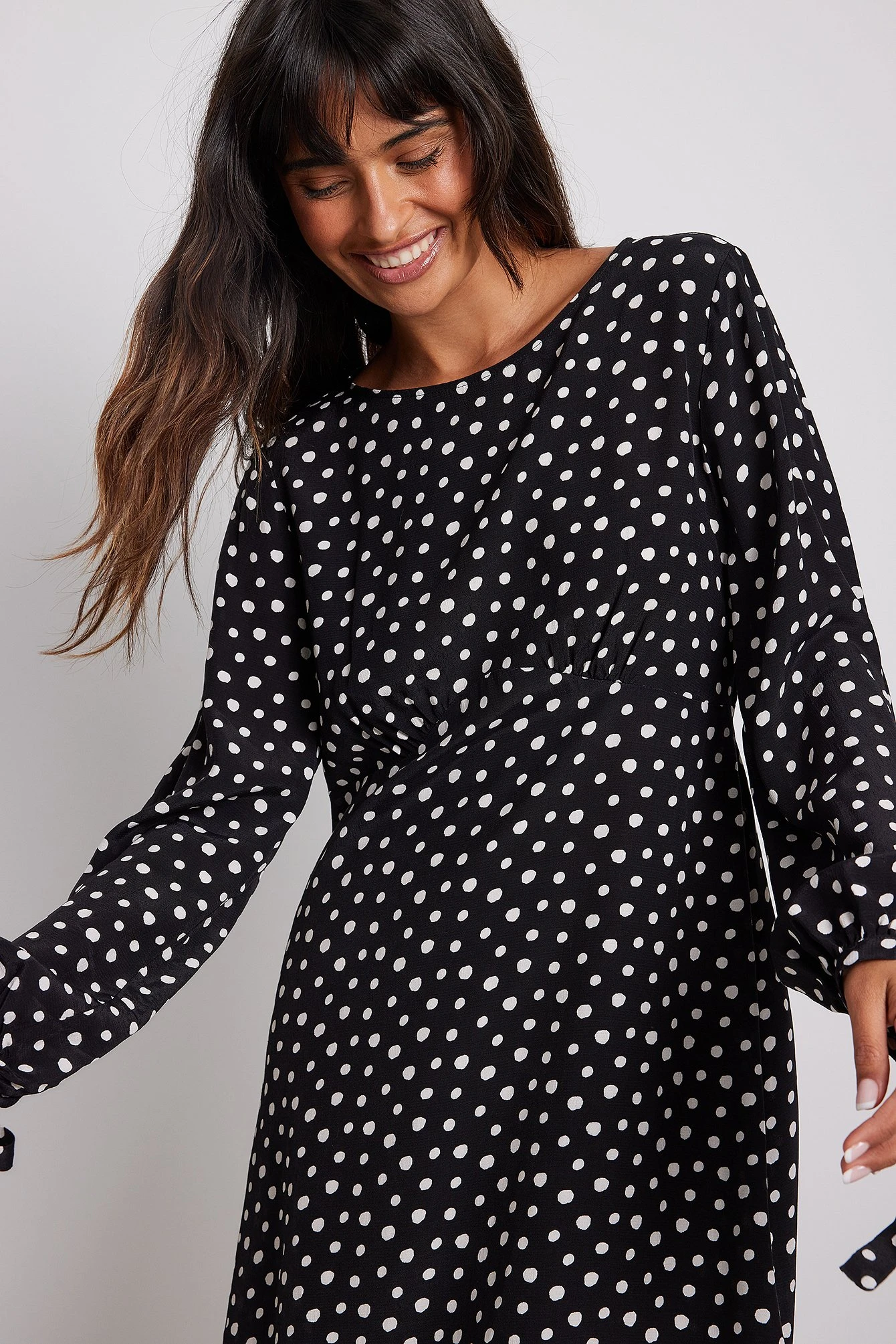 Cette robe courte a des manches longues avec noeud, une encolure bateau large avec bouton de fermeture Ă l’arrière, une fermeture Ă©clair latĂ©rale et une coupe fluide.