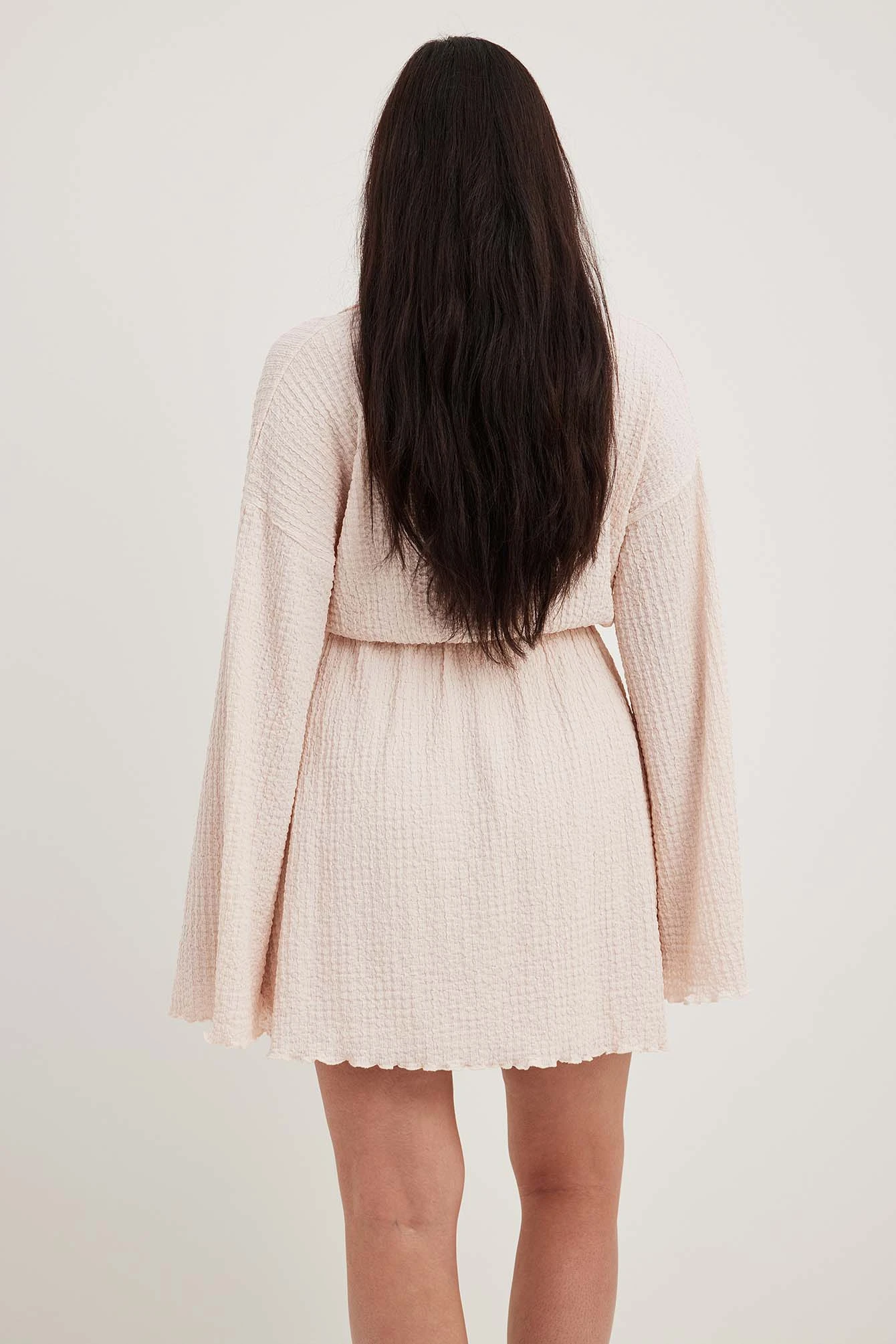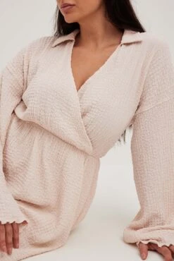 Cette robe courte a une matière texturée. Elle a une coupe fluide et un détail chevauchant avec col en V avec col. Cette robe courte a des manches longues larges et une ceinture élastique.