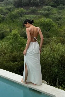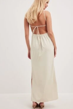 Cette robe longue est fluide et a un col carré avec cordon. Elle a des bretelles ajustables avec fermeture ajustable attachée. Notre robe longue a un design à dos ouvert avec lanière élastique et une fente latérale.