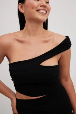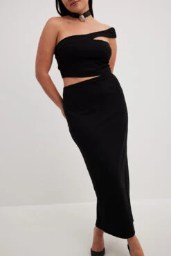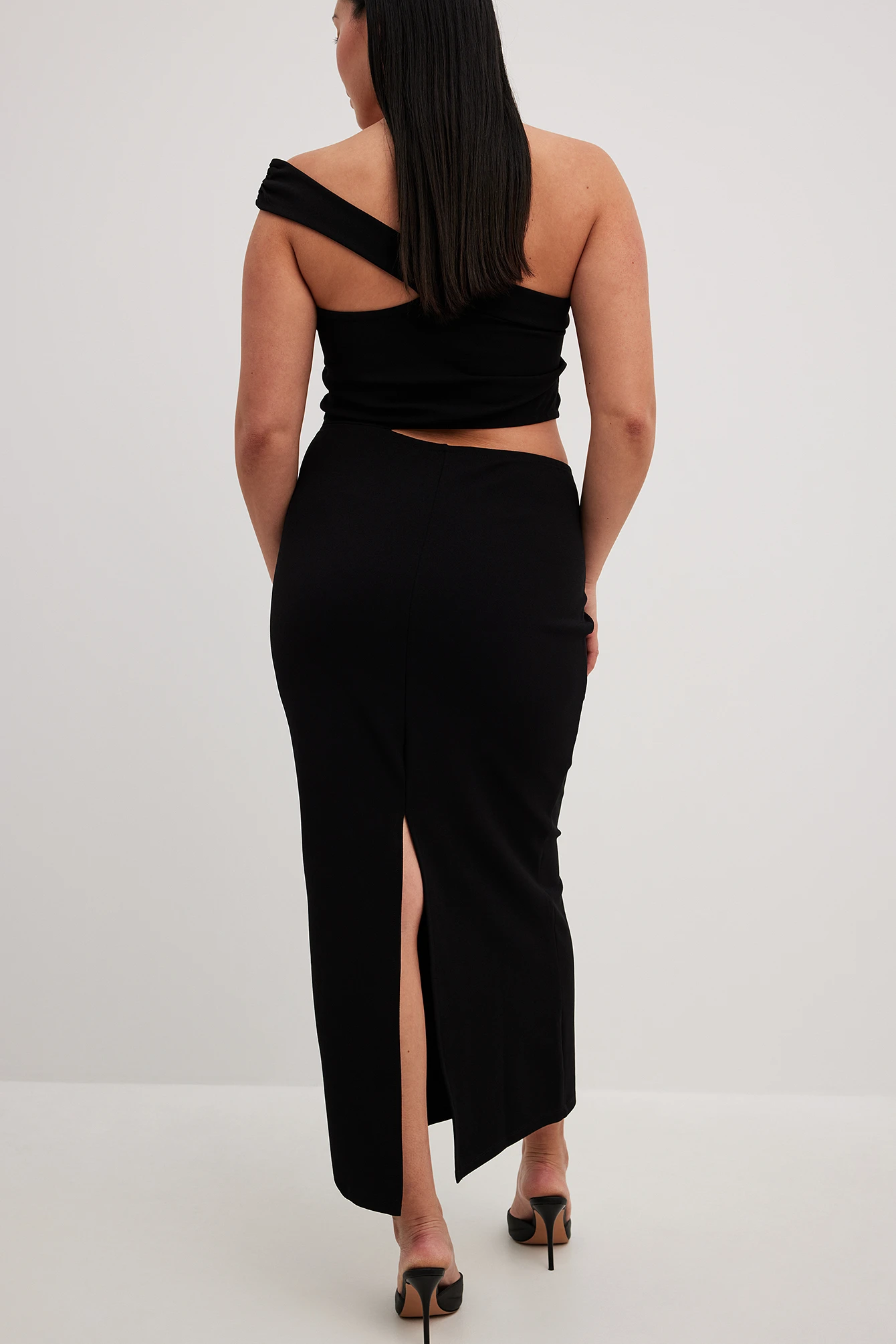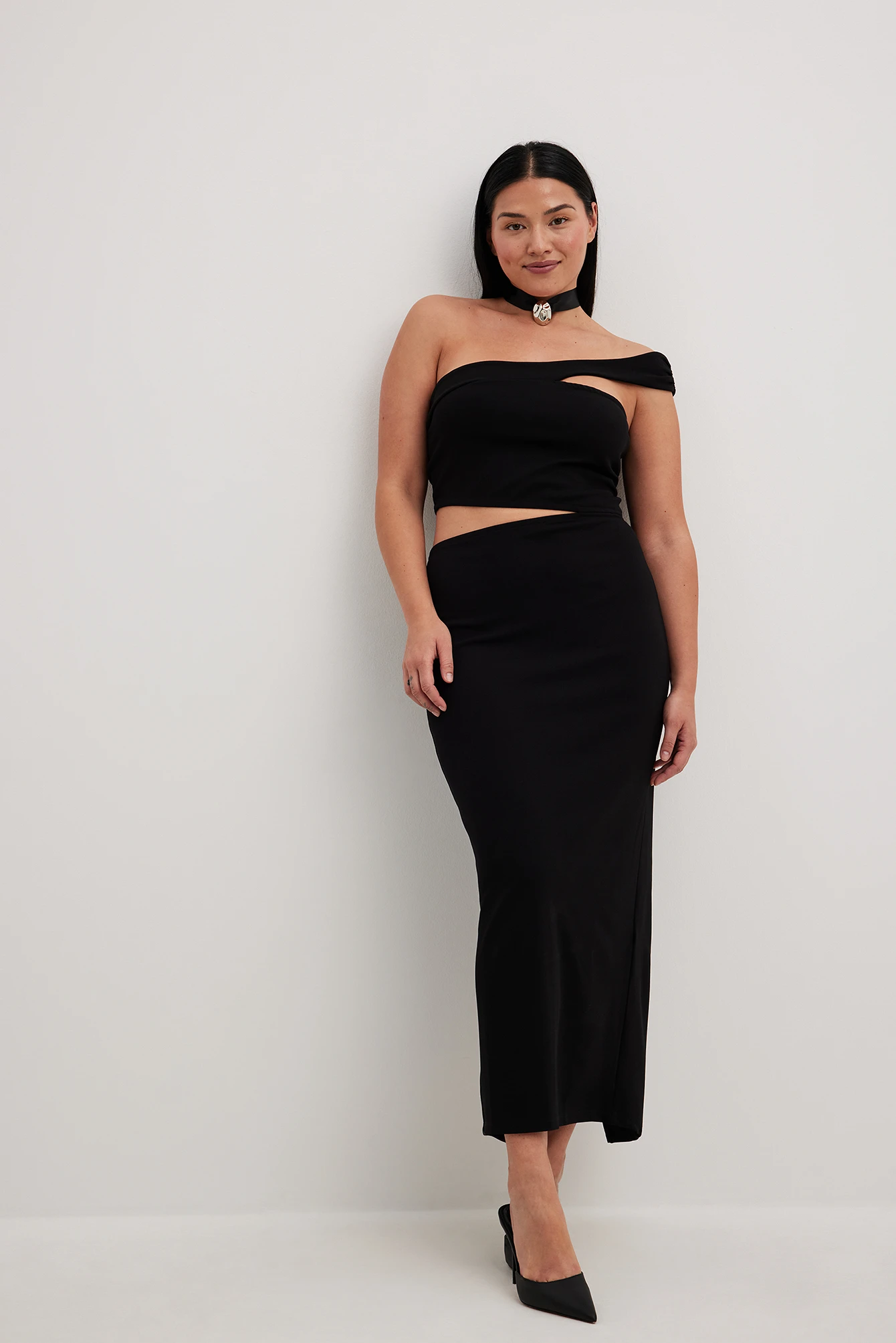 Cette robe midi est élastique et faite en tissu jersey et a de la forme serrée. Elle a un style à épaules dénudées asymétrique et garniture intérieure en silicone. Cette robe midi a un détail découpé et un détail fendu à l’arrière.