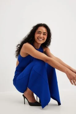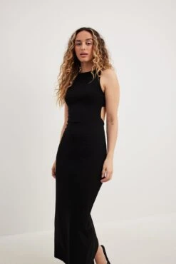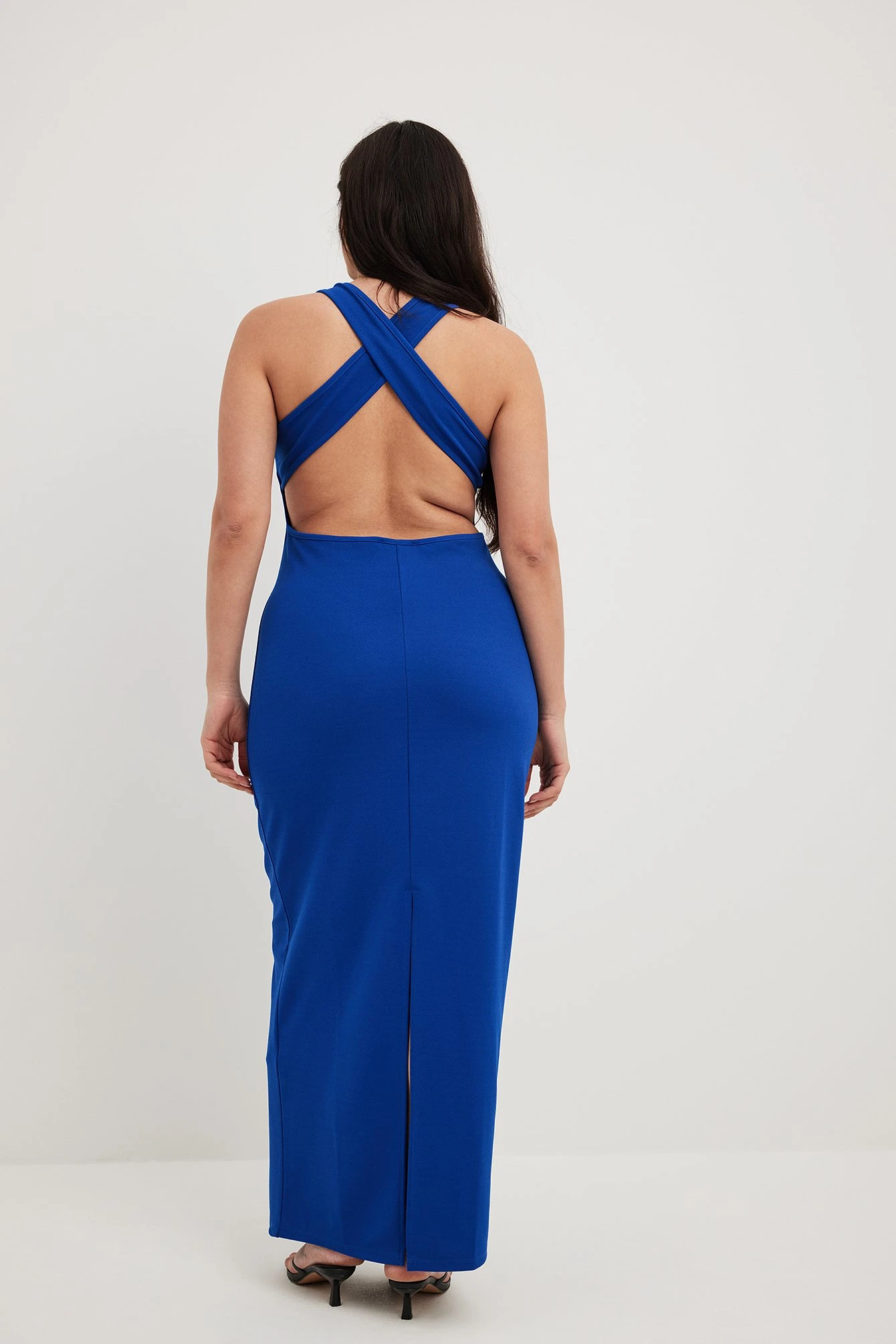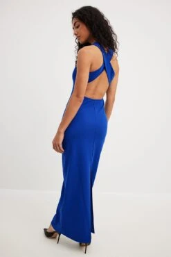 Cette robe longue a un col arrondi. Elle a des bretelles croisĂ©es Ă l’arrière et un design Ă dos ouvert. Cette robe longue a un dĂ©tail fendu arrière et une matière Ă©lastique.