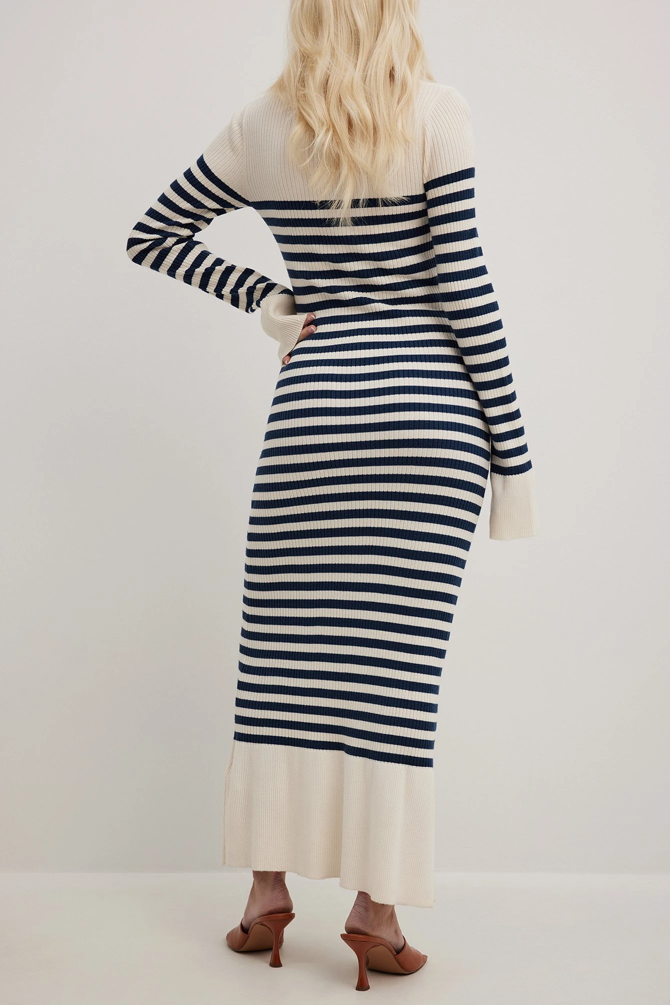 Cette robe longue est douce et élastique et a un design tricoté à nervures. Elle a un décolleté bateau et des manches longues avec manchettes légèrement plus larges.