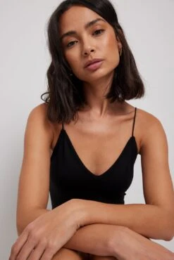 Cette robe courte a un col en V, des bretelles fines non ajustables et une coupe moulante élastique.