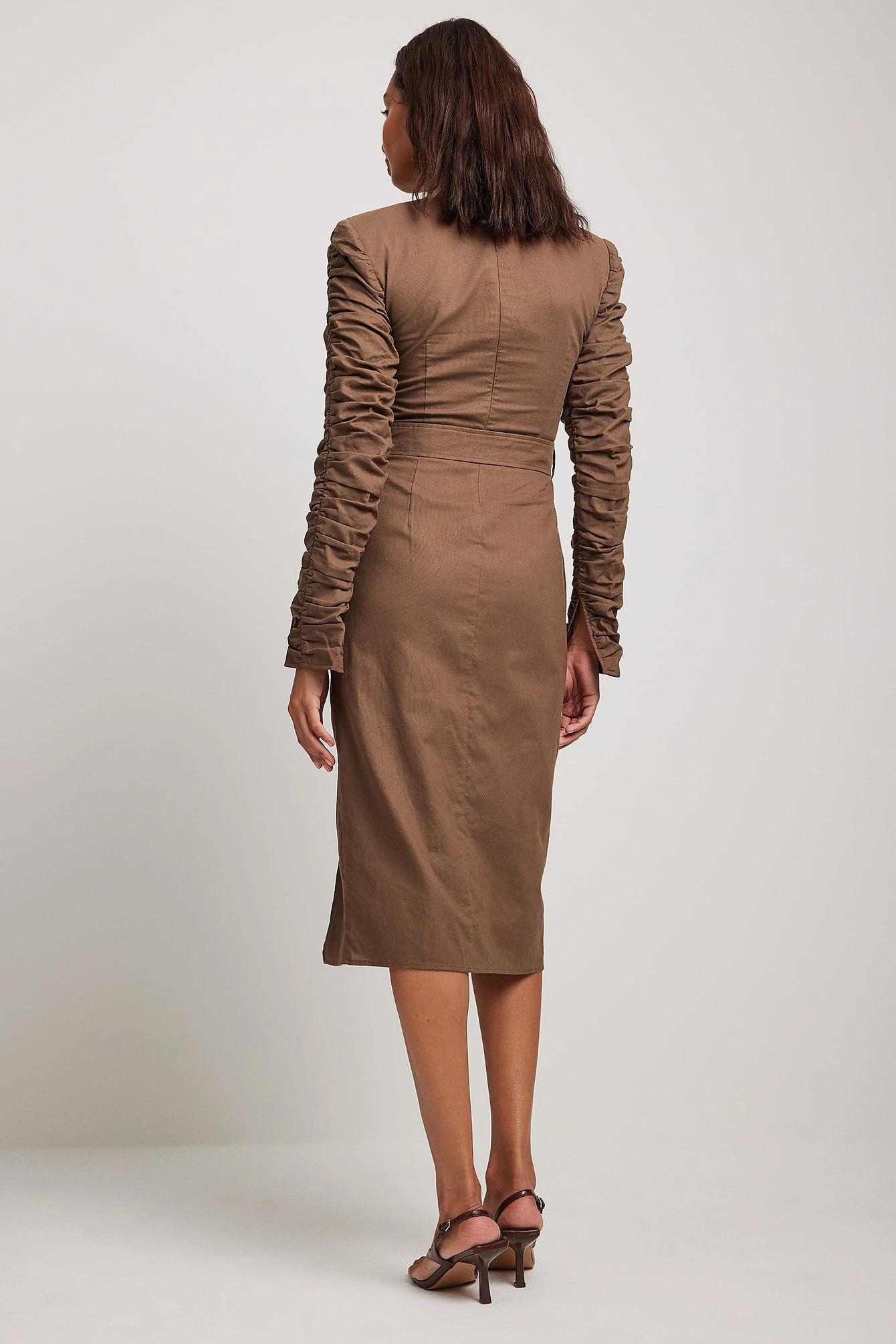 Cette robe a un col carrĂ©, des Ă©paules rembourrĂ©es, des manches longues avec ruche et manchettes avec dĂ©coupages, une fermeture au dos, une ruche Ă l’avant, une ceinture, une fente latĂ©rale, une taille midi, une doublure intĂ©rieure et une matière en lin.