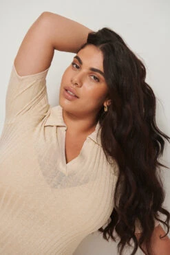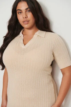 Cette robe midi a un col classique, des manches courtes et un design à côtes.