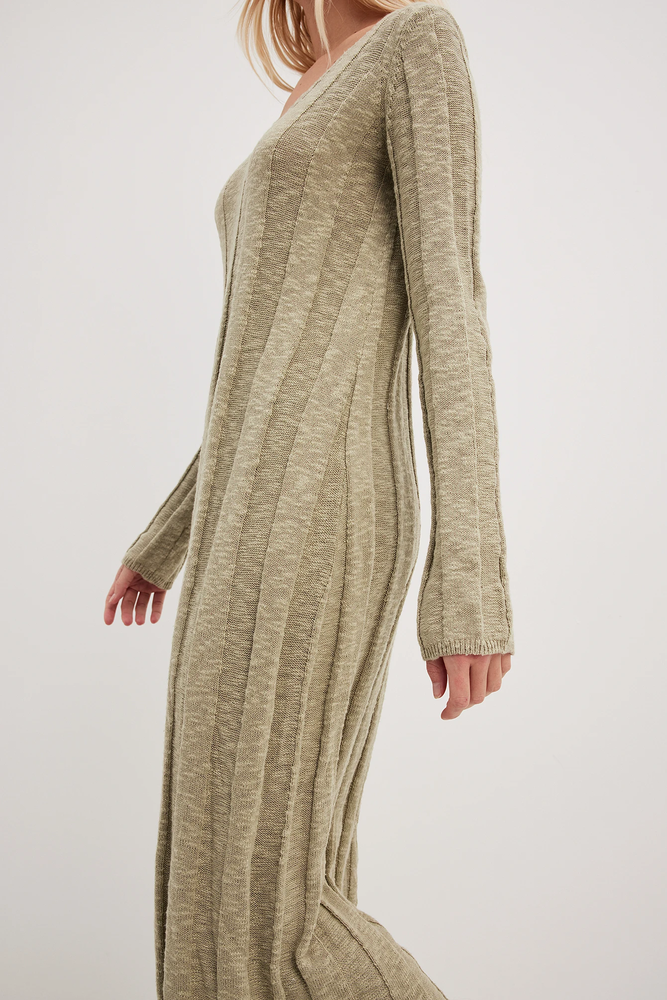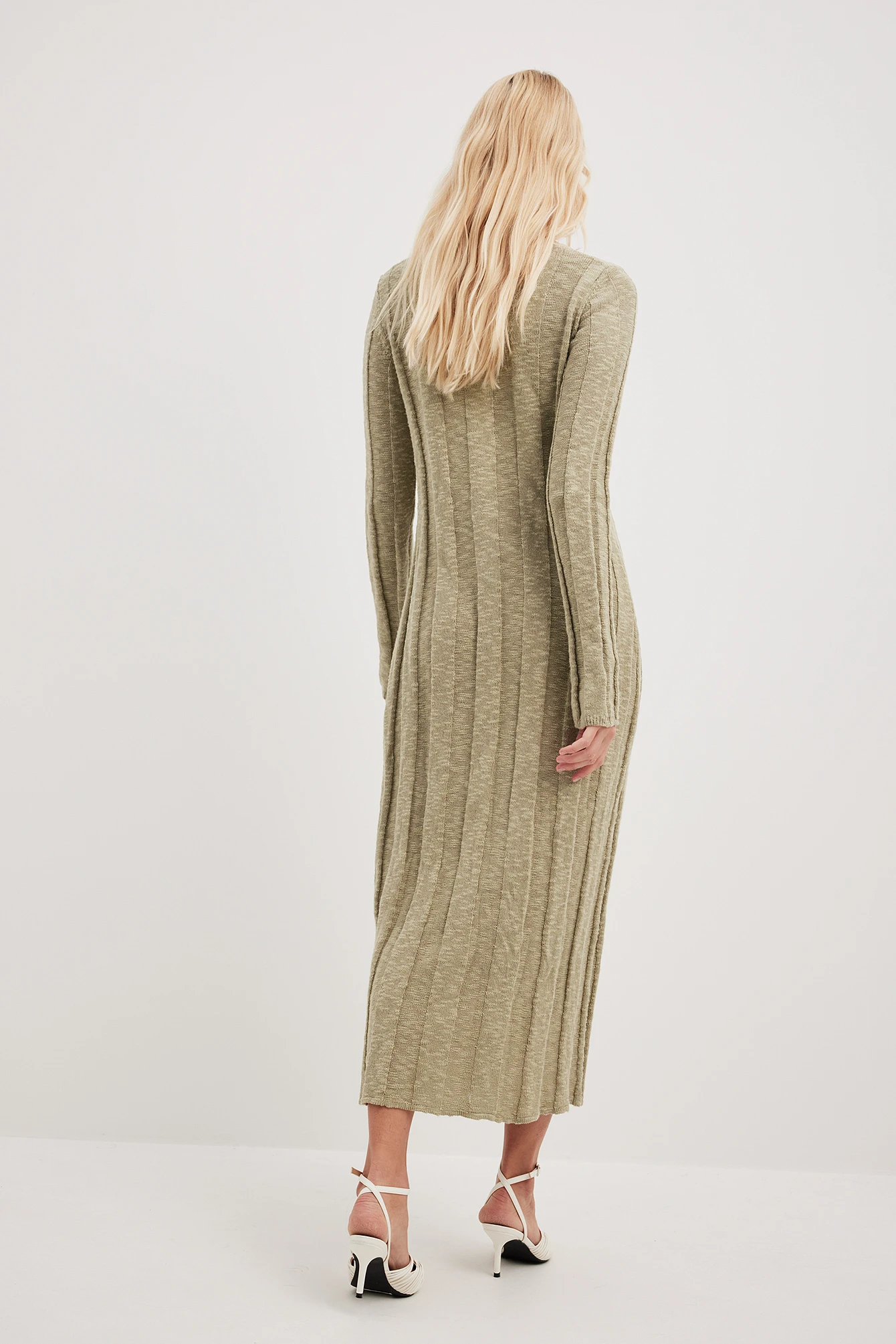 Cette robe midi est ajustée et a un design tricoté avec côtes larges. Elle a un col en V.