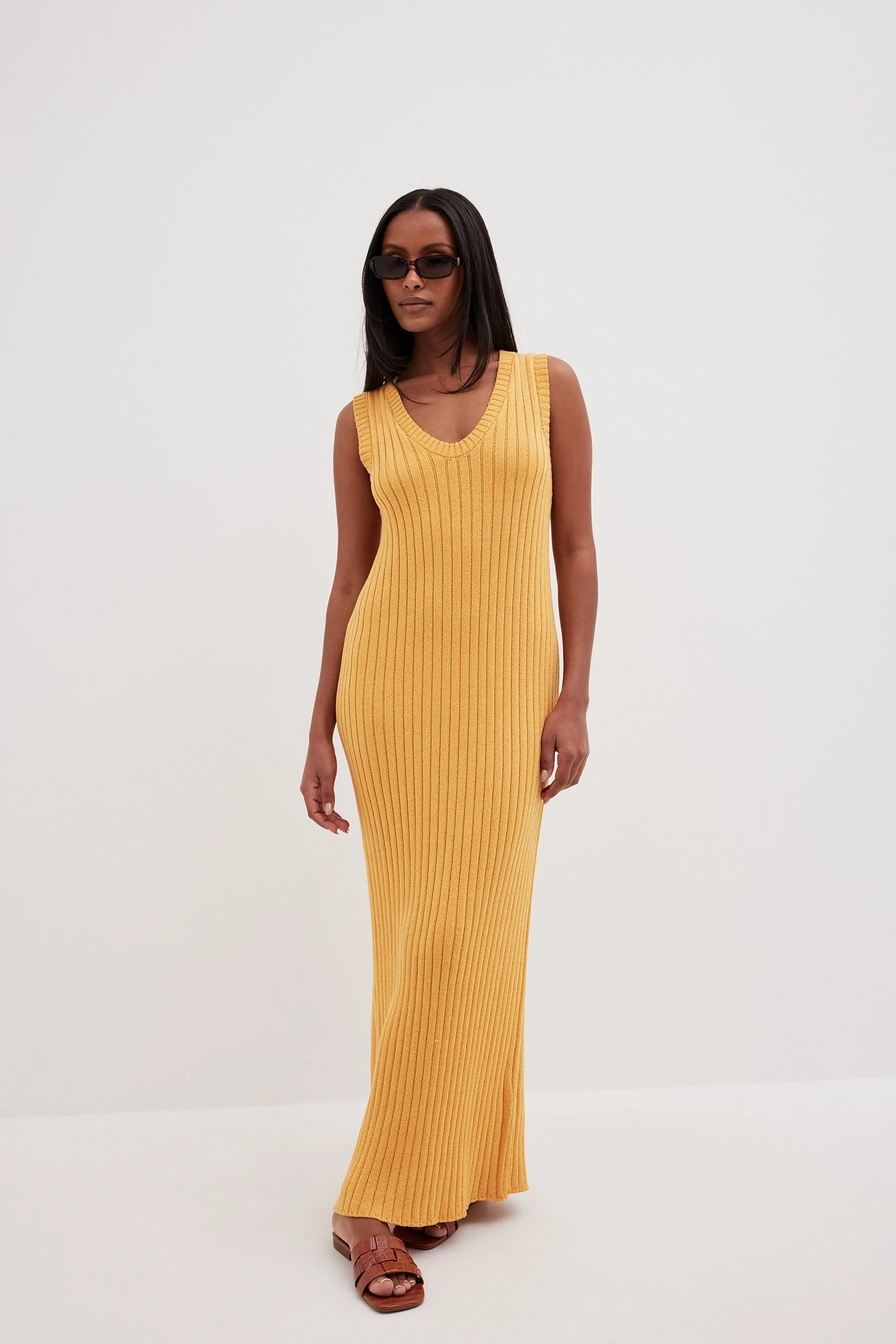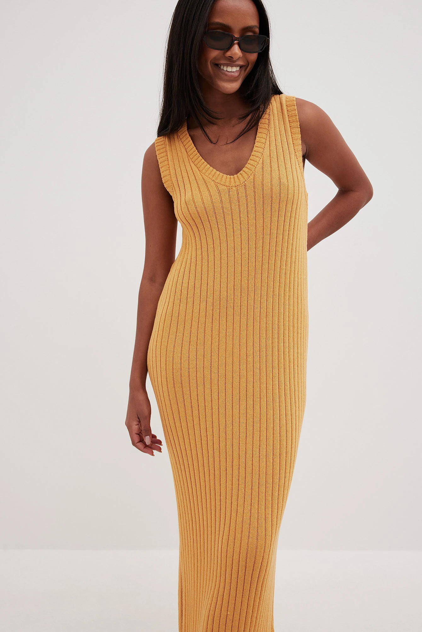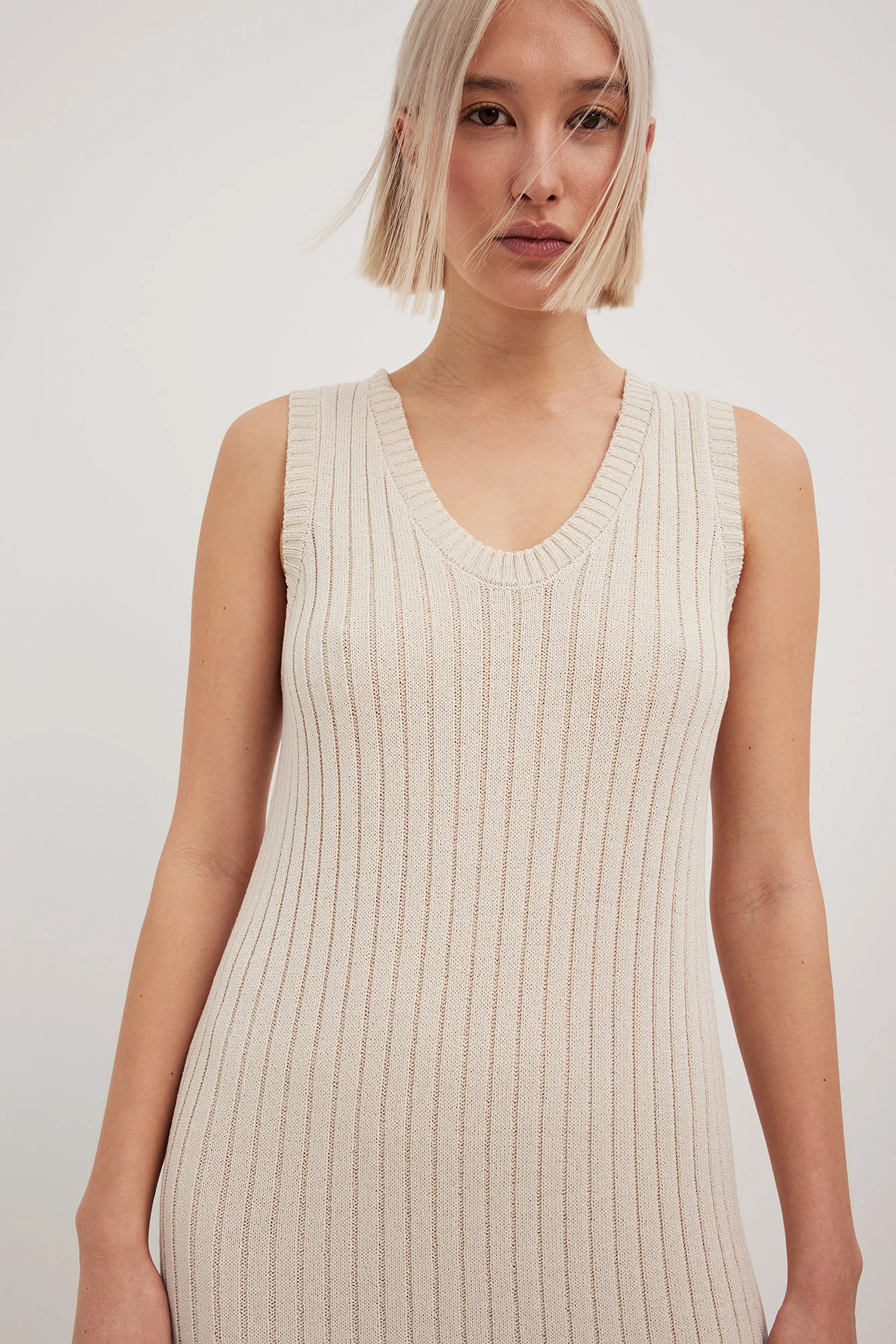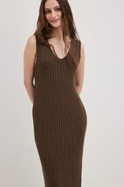 Cette robe est tricotée et élastique et a une taille midi. Elle a un design sans manches à nervures et un col en V large. Notre robe a une fente latérale basse sur un côté.