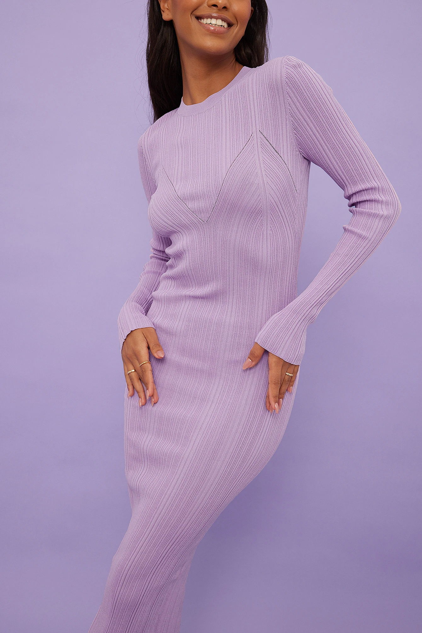 Cette robe midi est tricotée, à nervures et élastique et a un col arrondi, des manches longues et un découpage à l’arrière.
