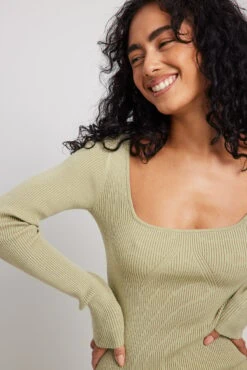 Cette robe midi a une encolure dégagée, des manches longues, une fente et une matière tricotée à nervures.