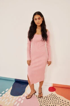Cette robe midi a une encolure dégagée, des manches longues, une fente et une matière tricotée à nervures.