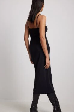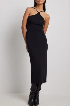 Cette robe a un modèle de bretelle à nouer dans le cou avec bretelles fines. Elle a une matière élastique en jersey nervuré et une taille midi.