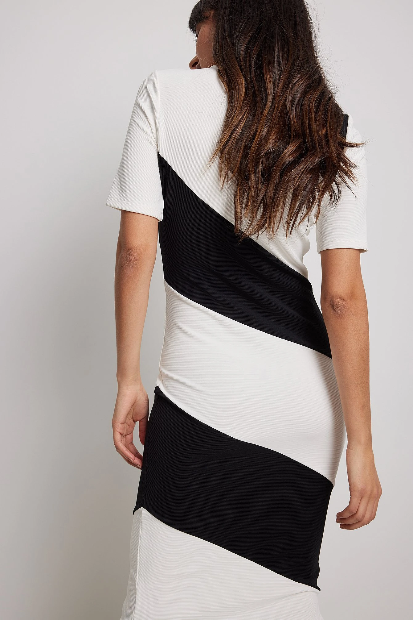 Cette robe midi est à nervures et ajustée et a un design rayé. Elle est à manches courtes.