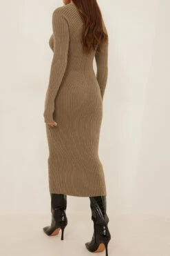 Cette robe midi a un col arrondi, des manches longues et une matière tricotée à nervures.