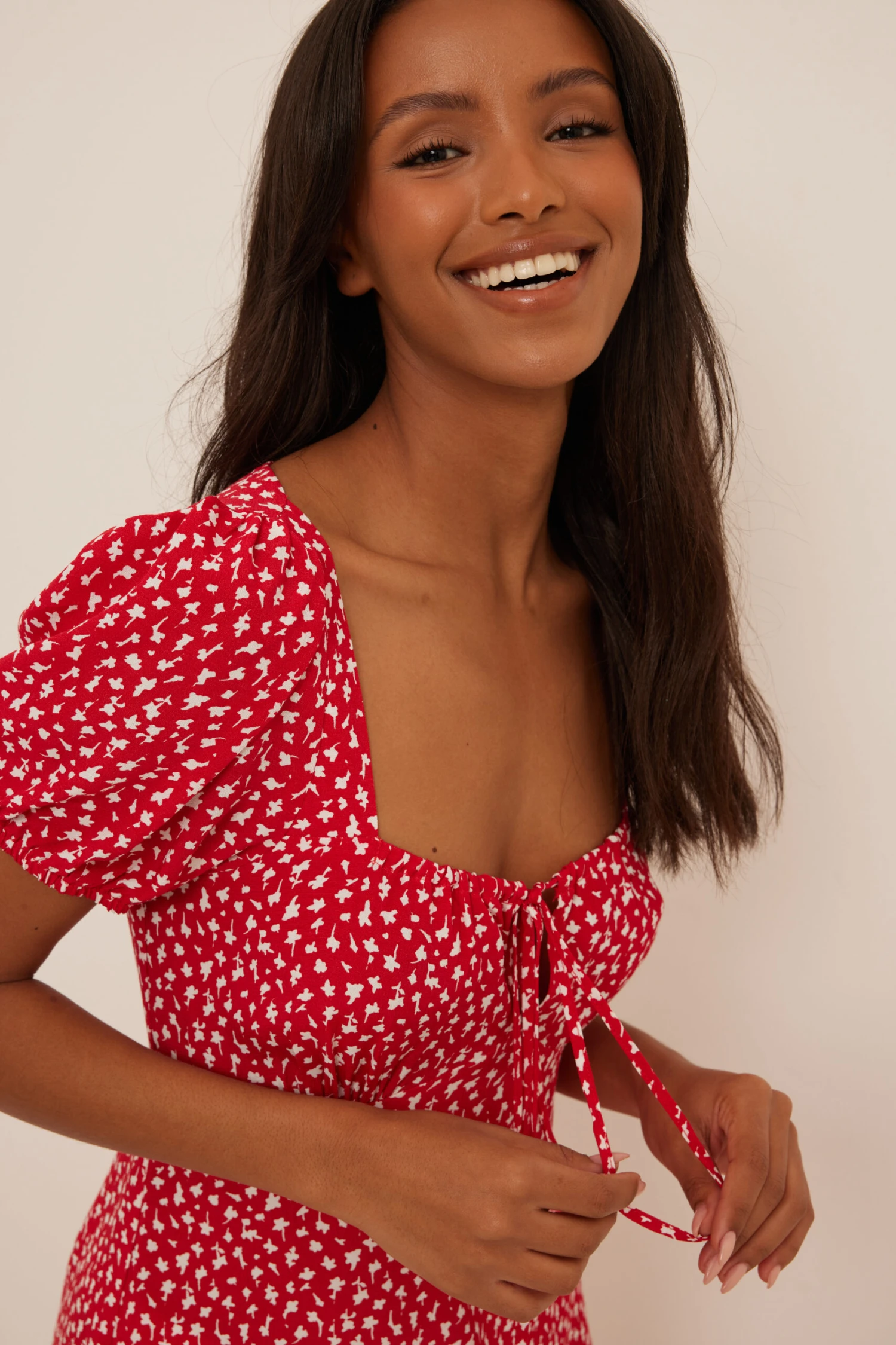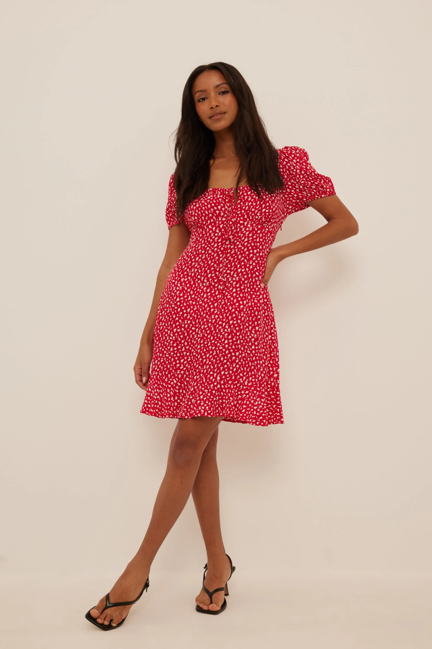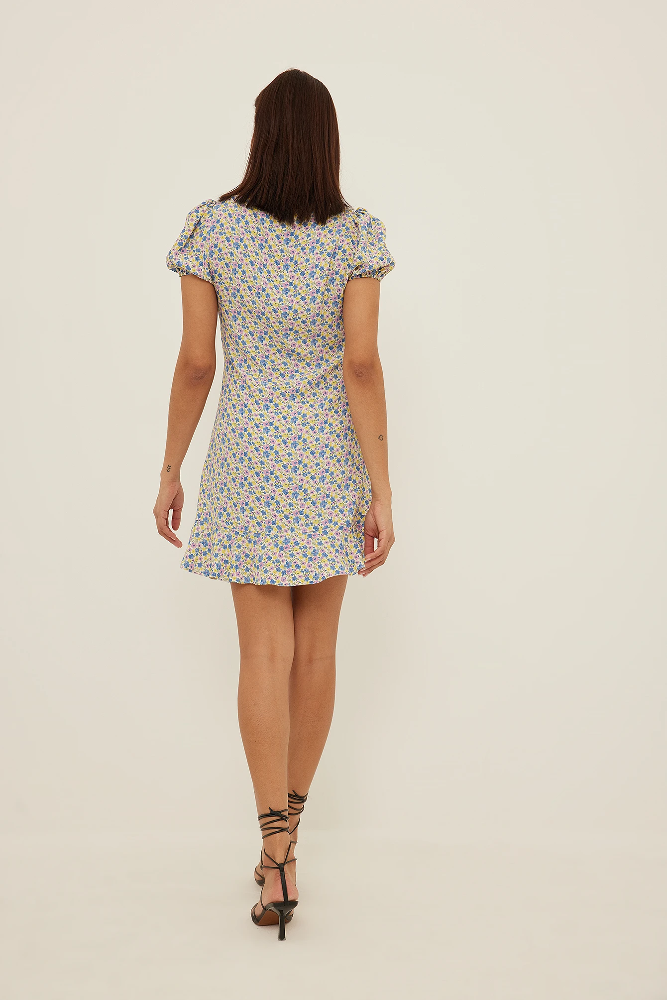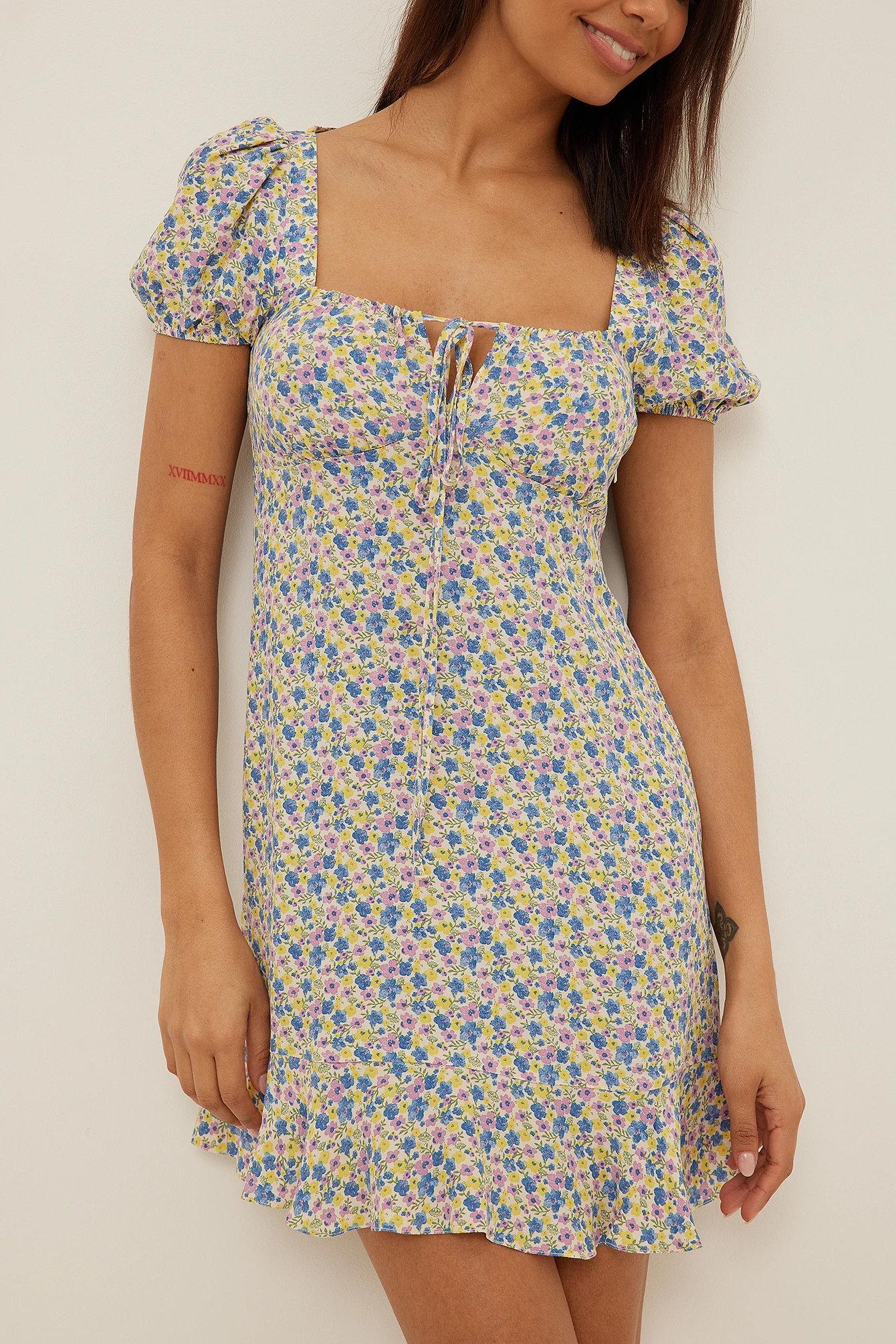 Cette robe courte est faite en viscose et a des manches bouffantes courtes, un décolleté en coeur avec cordon et noeud à nouer, une coupe fluide et un ourlet inférieur avec designs à volants.