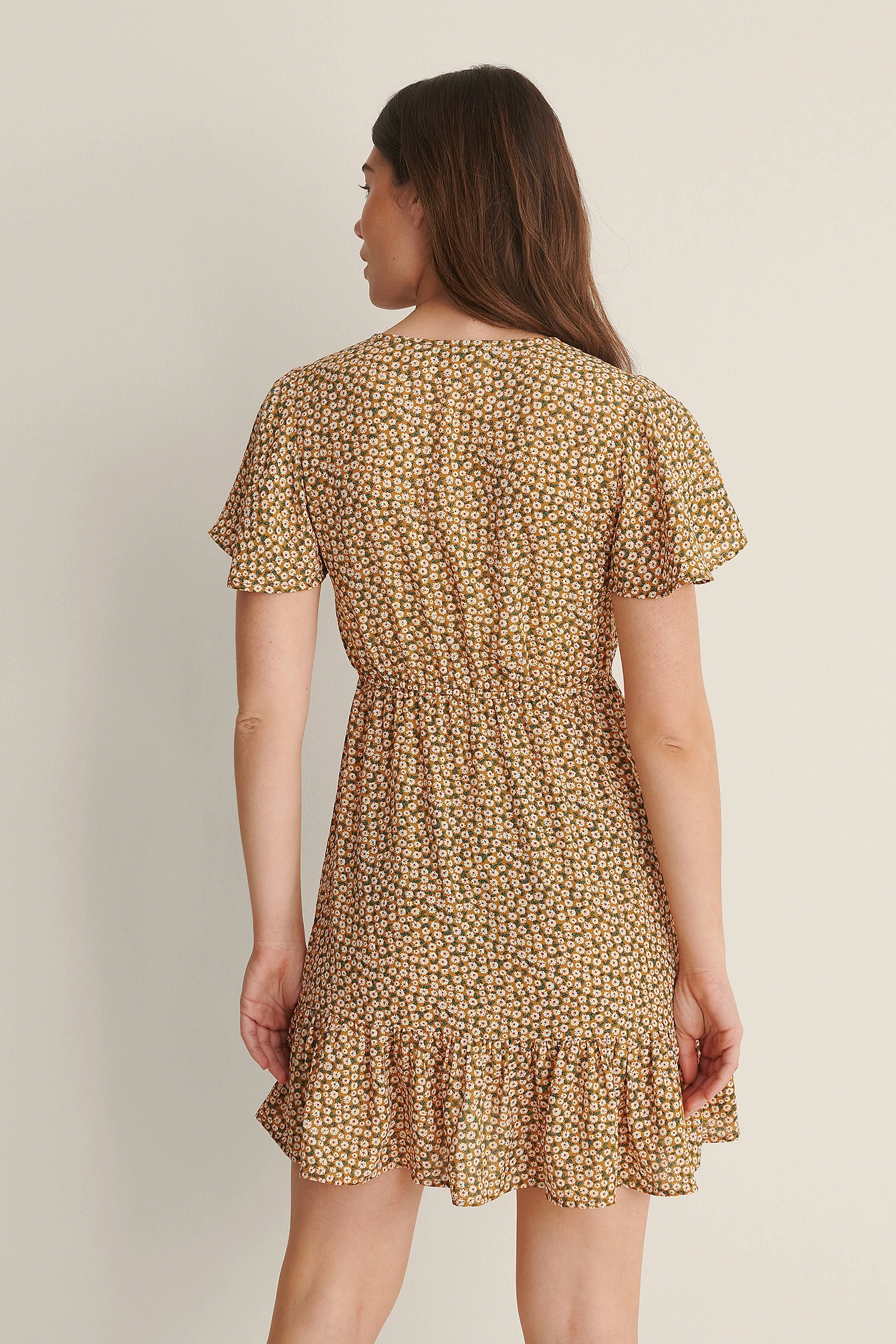 Cette robe a un col en V, des manches courtes, des boutons de fermeture à l’avant, une ceinture élastique, un détail volanté au bas, une taille courte et une coupe fluide.