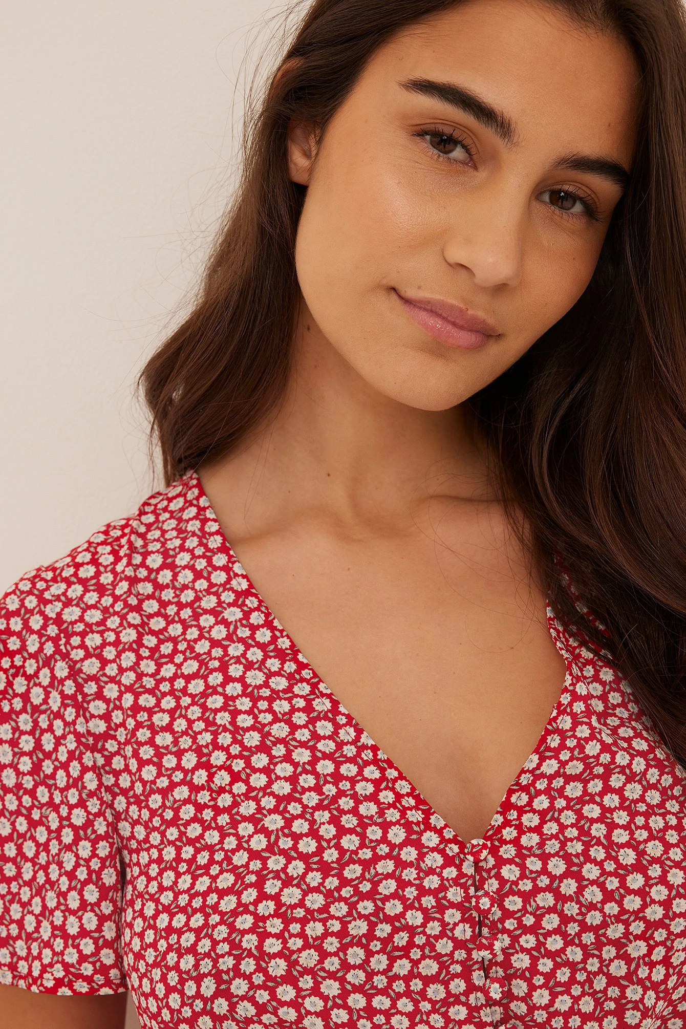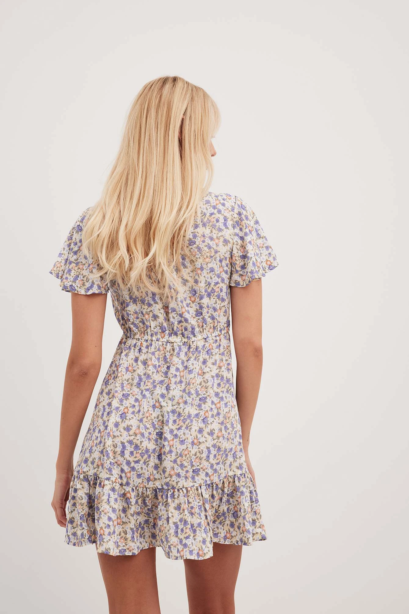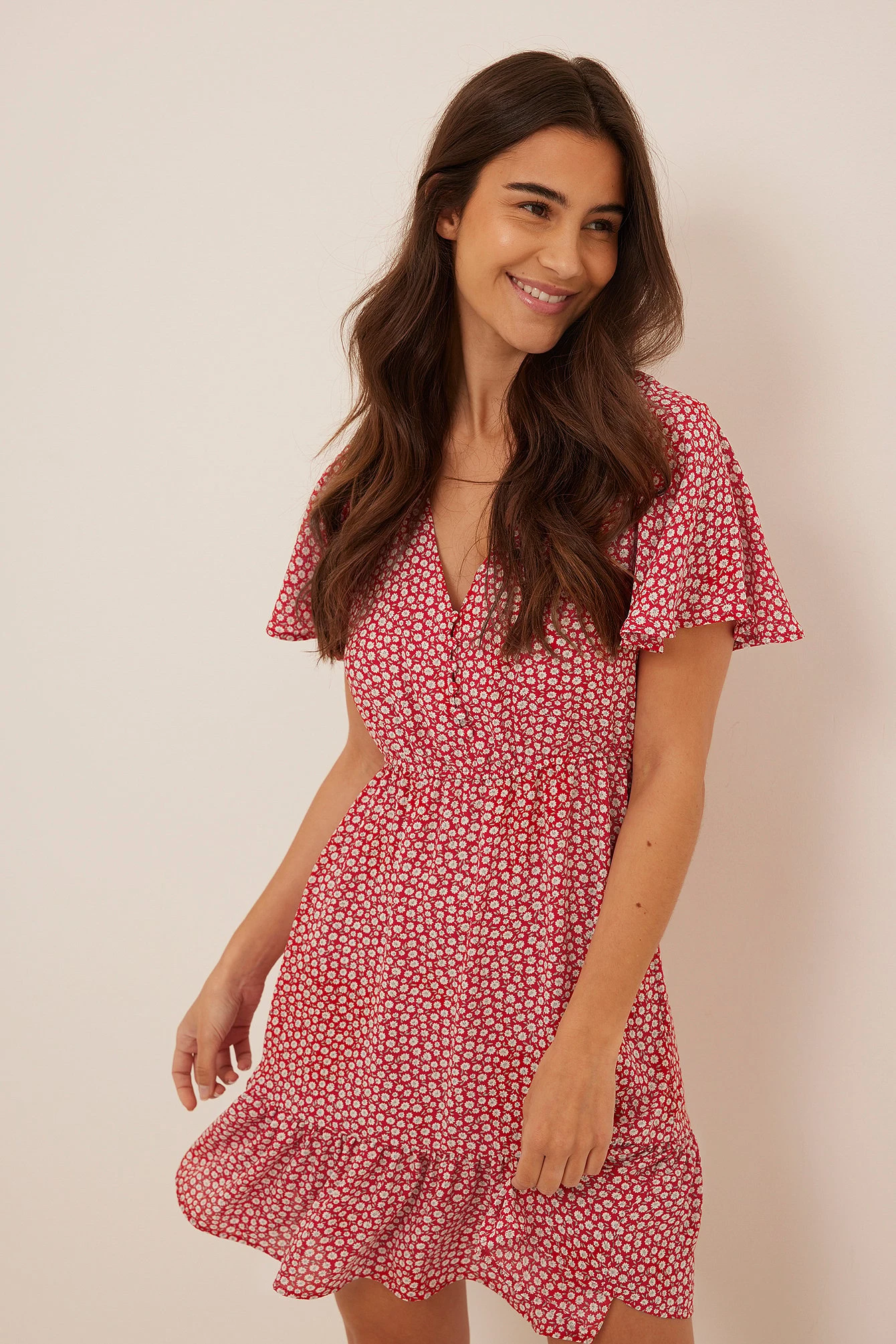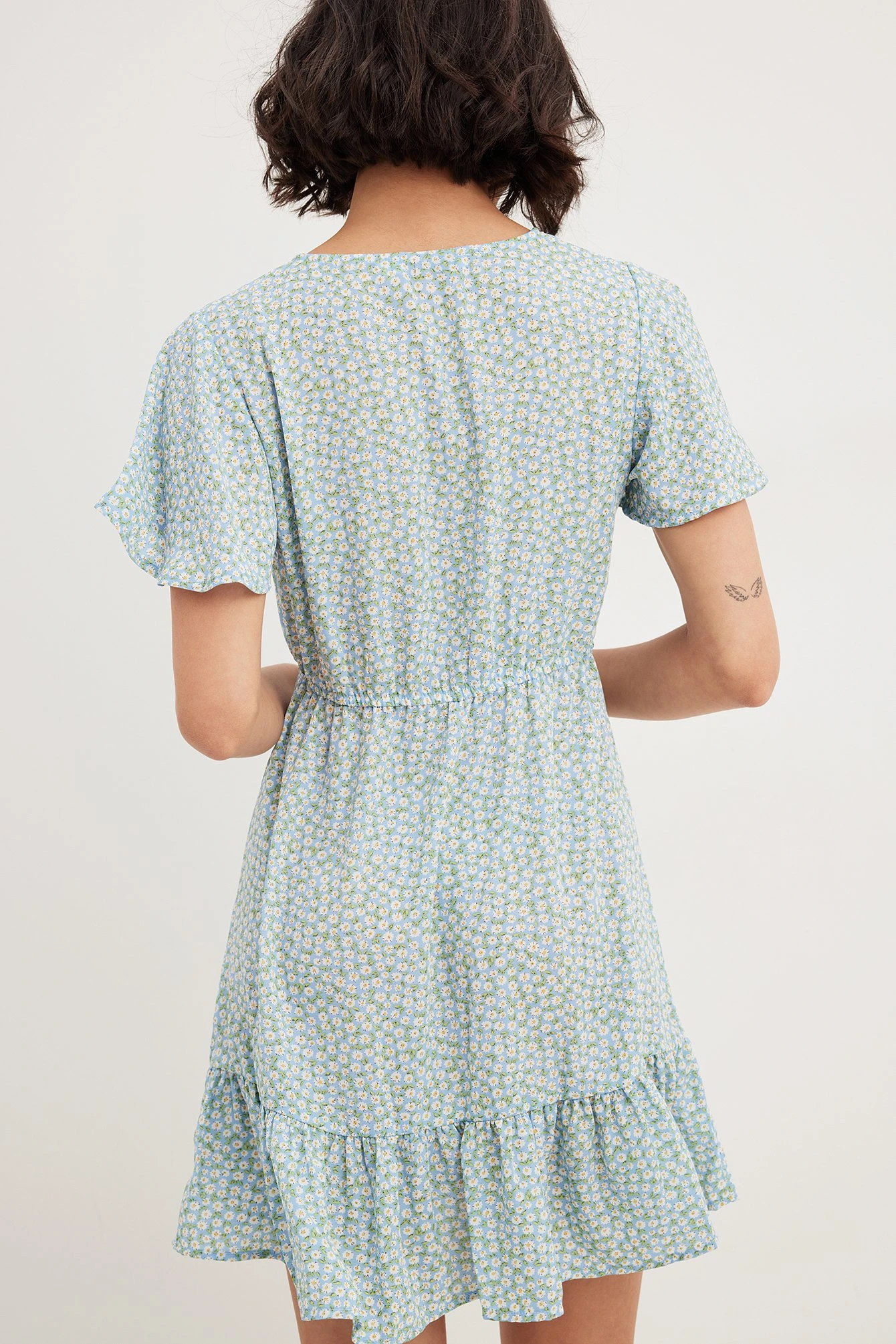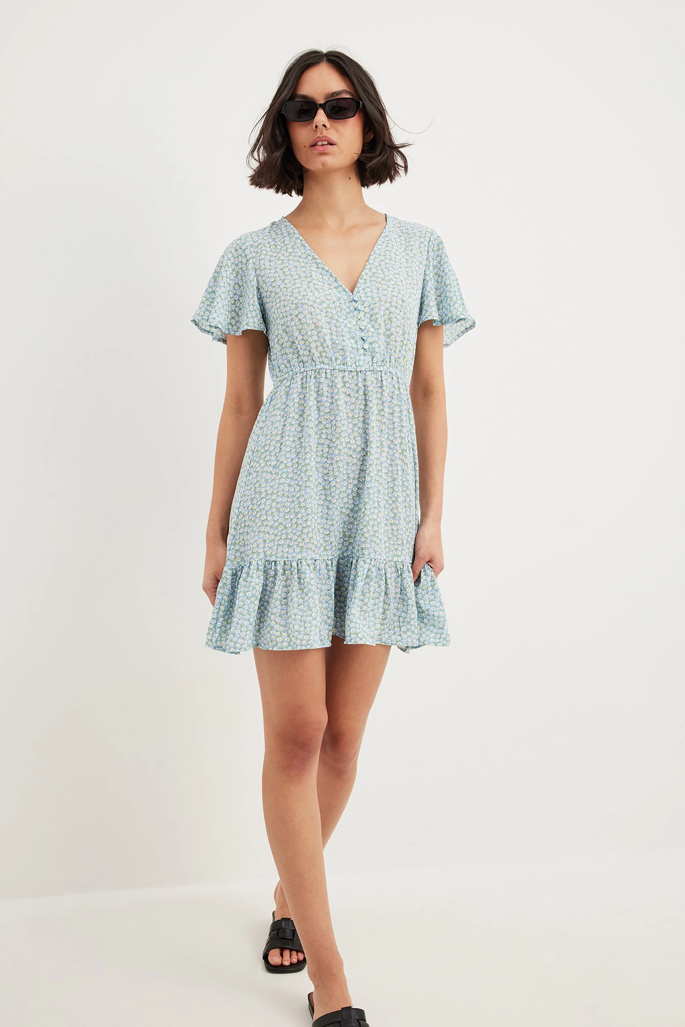Cette robe courte a un col en V, des boutons à l’avant, une ceinture élastique fine, des manches courtes fluides, ourlet inférieur à volants et une matière fine et fluide.
