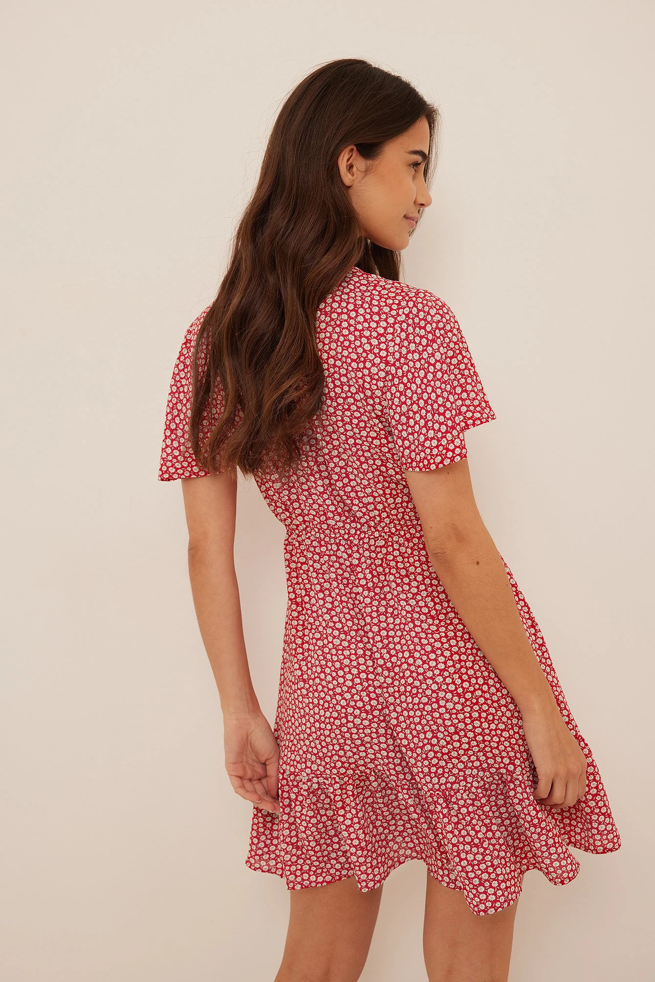 Cette robe courte a un col en V, des boutons à l’avant, une ceinture élastique fine, des manches courtes fluides, ourlet inférieur à volants et une matière fine et fluide.