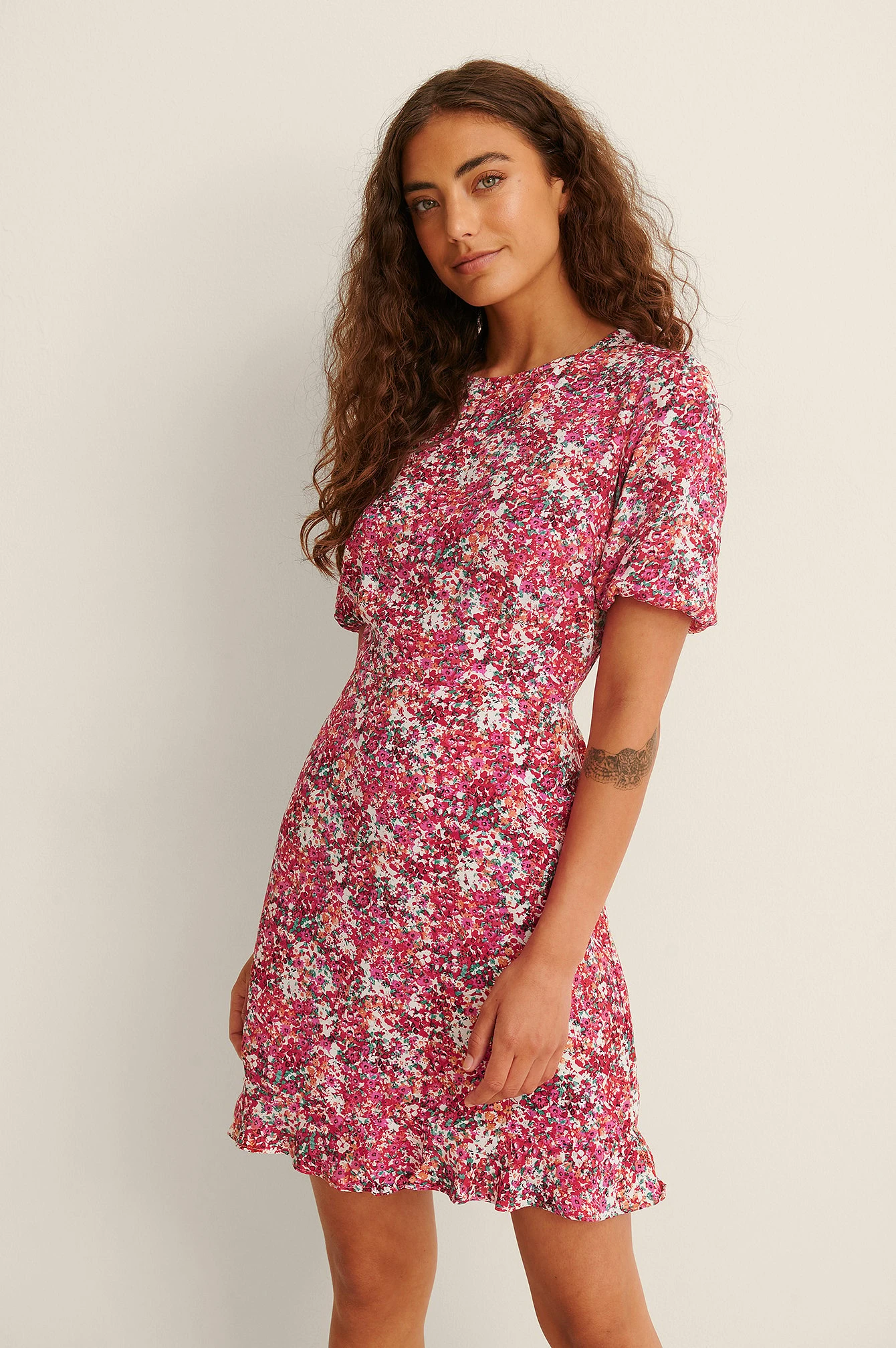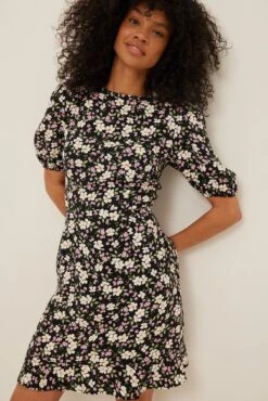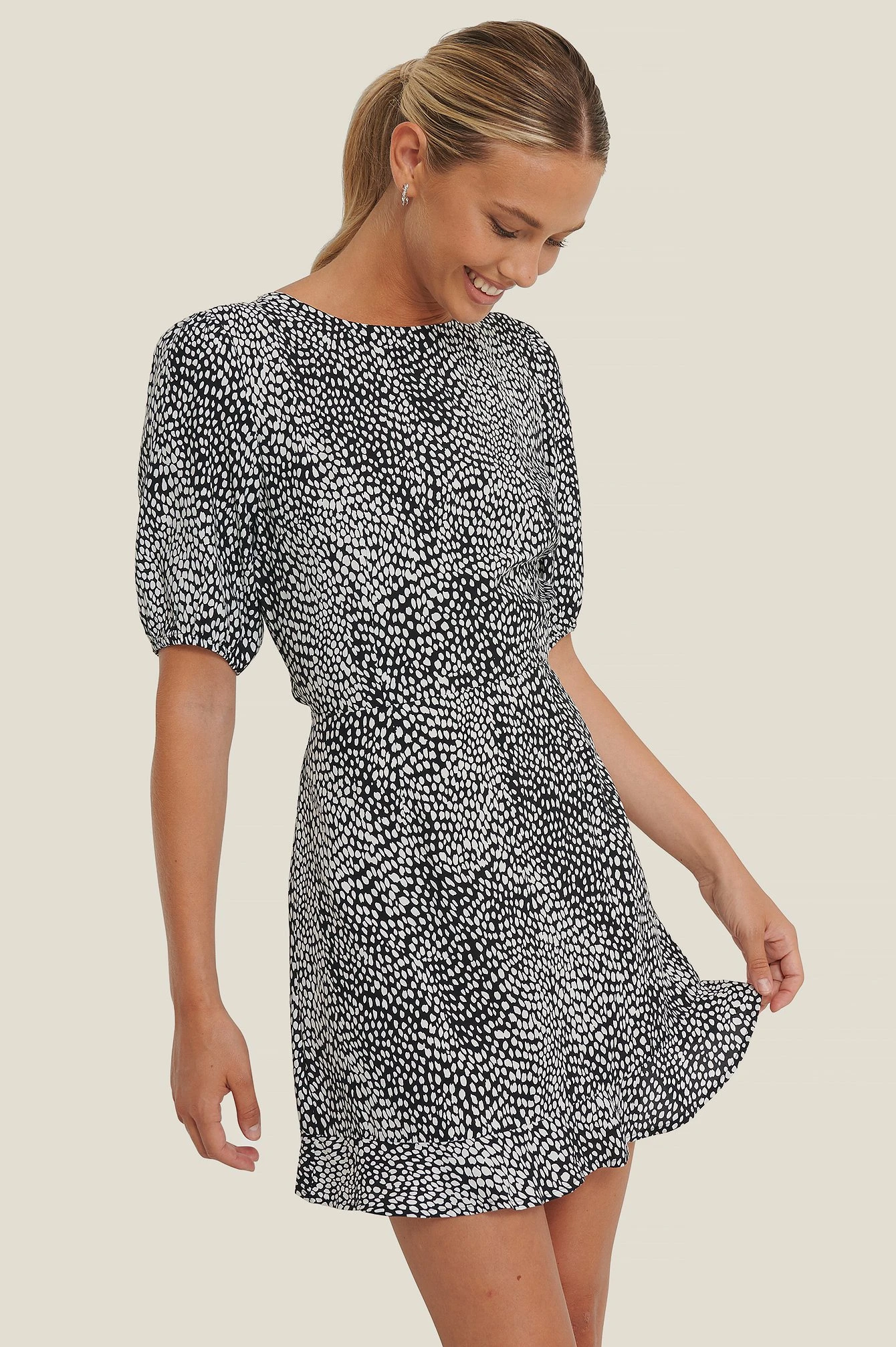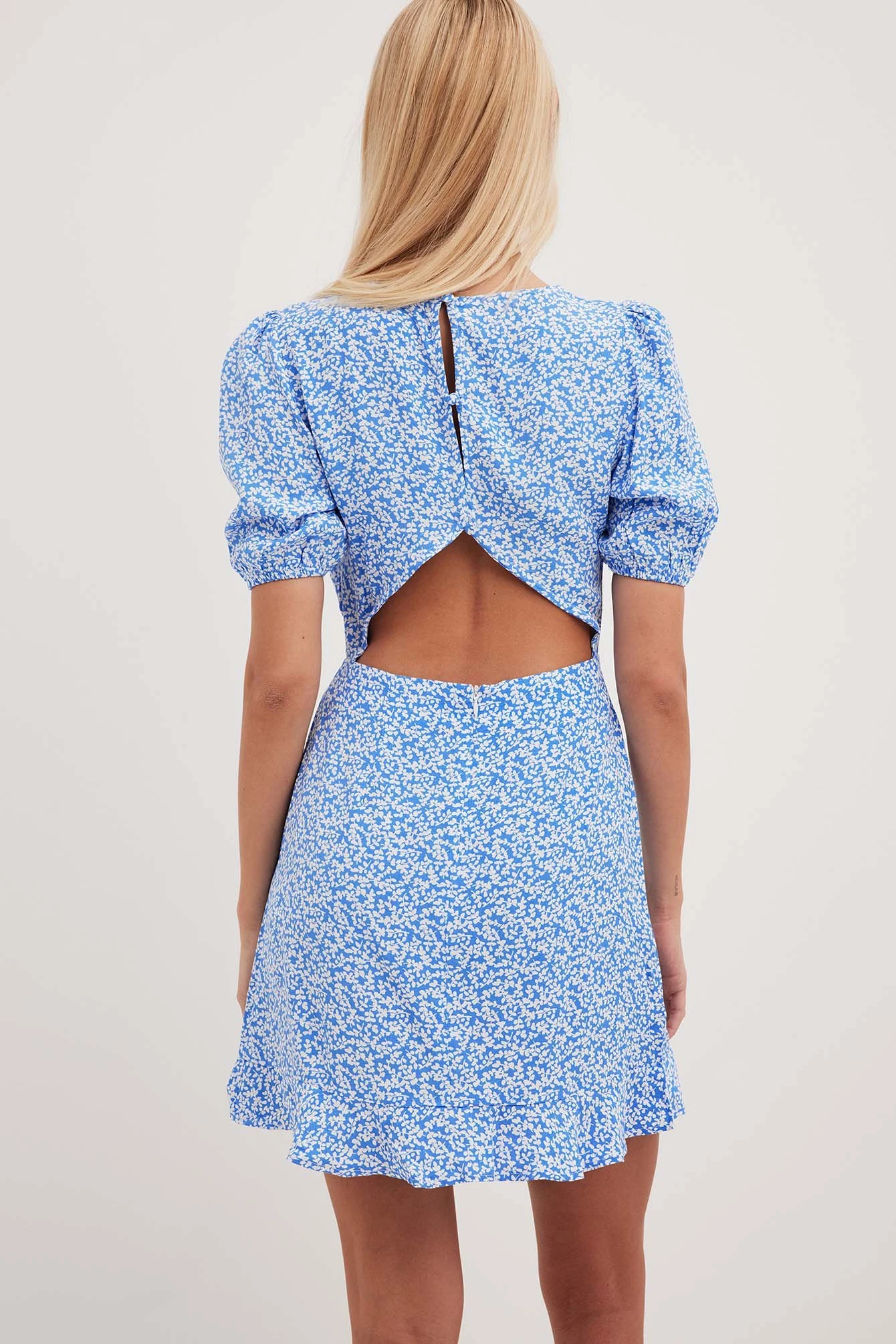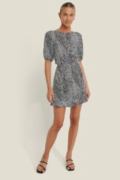 Cette robe a un col arrondi, des manches courtes avec manchettes Ă©lastiques, des boutons de fermeture derrière la nuque, un dĂ©tail dĂ©coupĂ© Ă l’arrière avec fermeture Ă©clair et crochet de fermeture cachĂ©e sous, des dĂ©tails volantĂ©s sur l’ourlet bas et une taille courte.