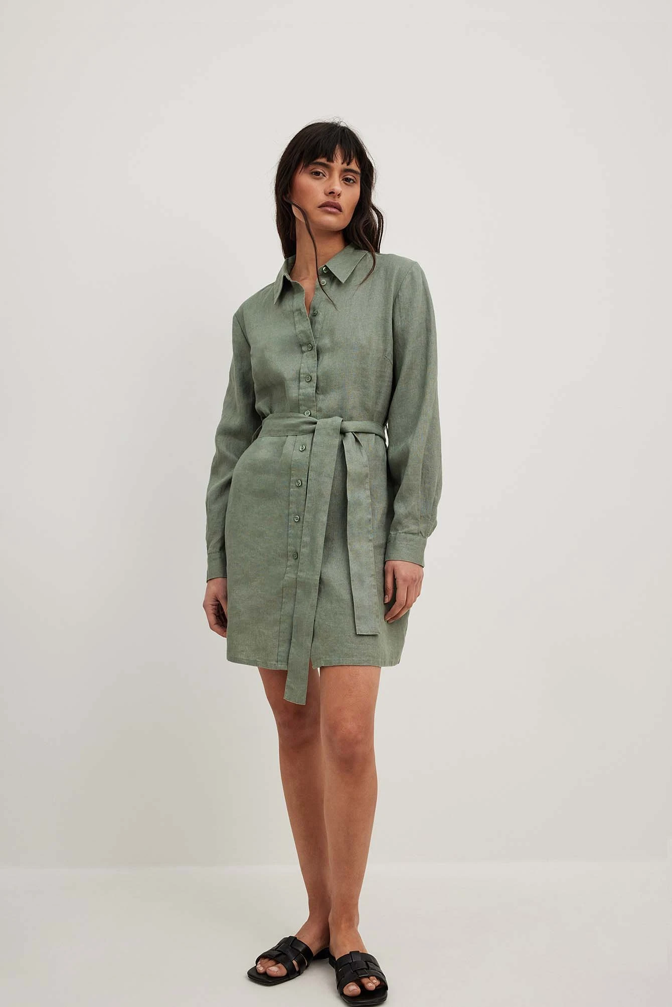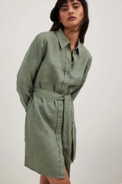 Cette robe chemise est faite en lin et a un col classique. Elle a des manches longues avec manchette simple et une taille courte. Notre robe chemise a une ceinture ajustable amovible et un bouton de fermeture.